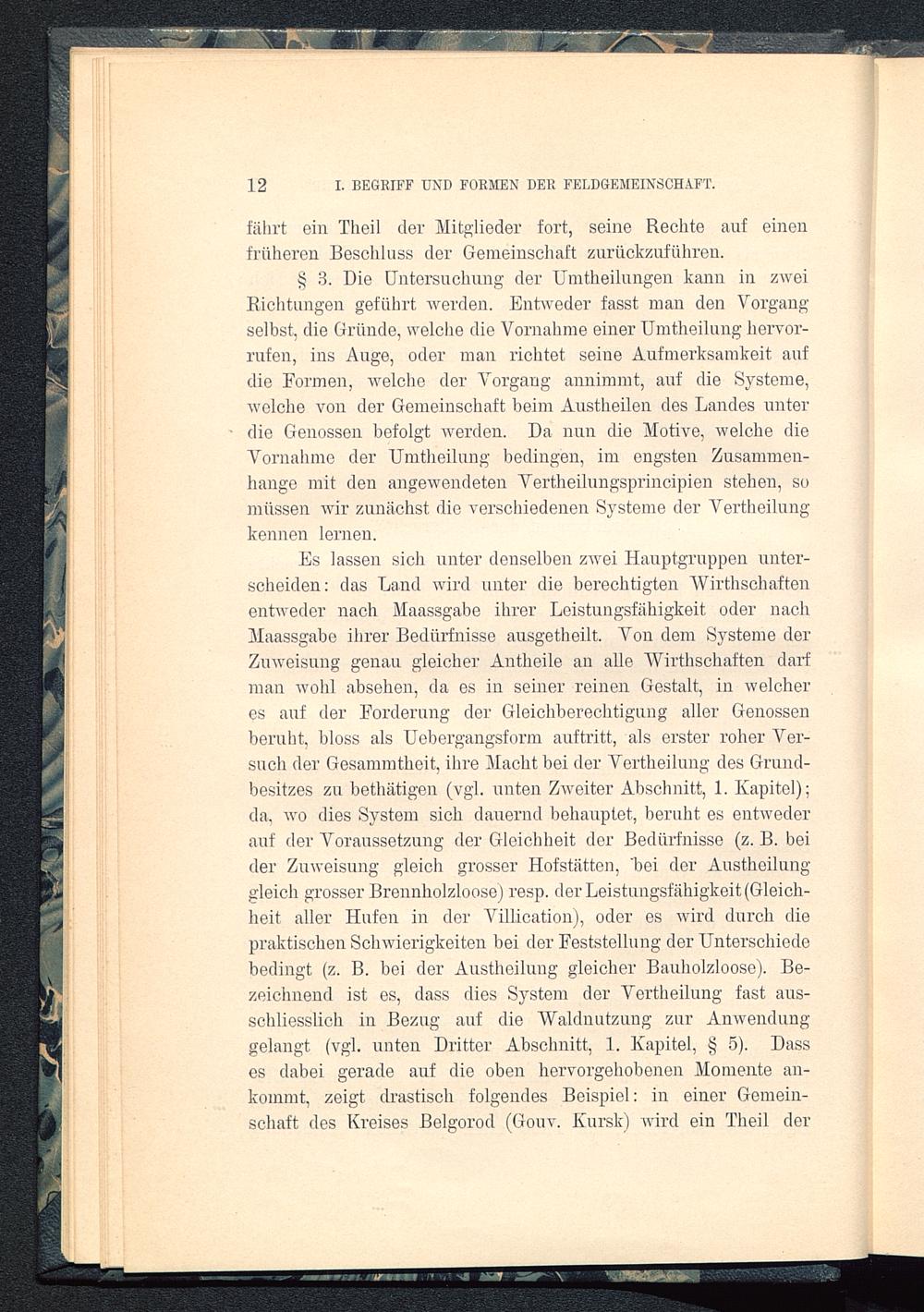 § 3. Die Untersuchung der Unitheilungen kann in zweiRichtungen geführt werden. Entweder fasst man den Vorgangselbst, die Gründe, welche die Vornahme einer Umtheilung liervor-rufen, ins Auge, oder man richtet seine Aufmerksamkeit aufdie Formen, welche der Vorgang annimmt, auf die Systeme,welche von der Gemeinschaft beim Austheilen des Landes unterdie Genossen befolgt werden. Da nun die Motive, welche dieVornahme der Umtheilung bedingen, im engsten Zusammen-hänge mit den angewendeten Vertheilungsprincipien stehen, somüssen wir zunächst die verschiedenen Systeme der Vertheilungkennen lernen.