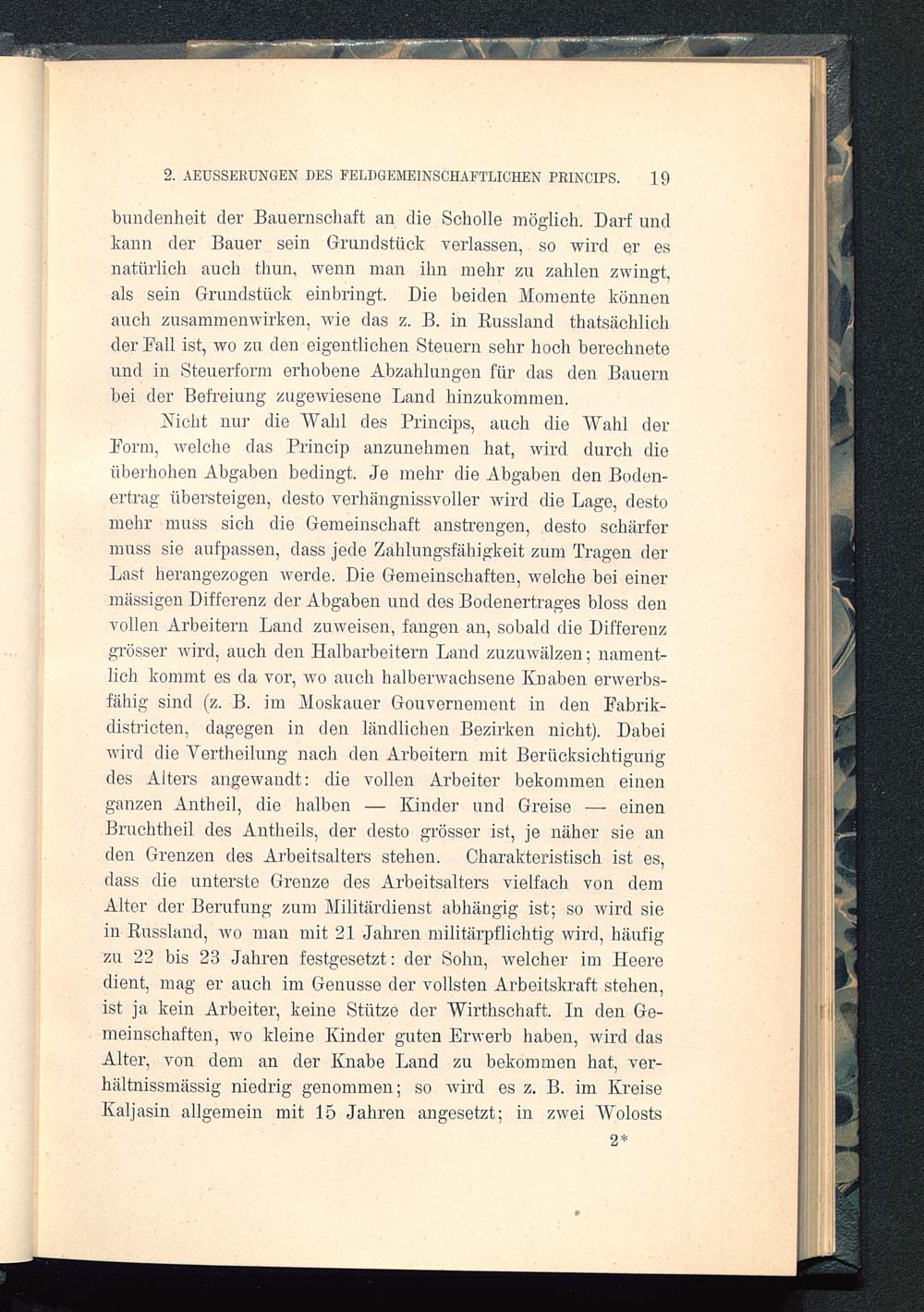 Rieht nur die "Wahl des Princips, auch die Wahl derForm, welche das Princip anzunehmen hat, wird durch dieüberhohen Abgaben bedingt. Je mehr die Abgaben den Boden-ertrag übersteigen, desto verhängnissvoller wird die Lage, destomehr muss sich die Gemeinschaft anstrengen, desto schärfermuss sie aufpassen, dass jede Zahlungsfähigkeit zum Tragen derLast herangezogen werde. Die Gemeinschaften, welche bei einermässigen Differenz der Abgaben und des Bodenertrages bloss denvollen Arbeitern Land zuweisen, fangen an, sobald die Differenzgrösser wird, auch den Halbarbeitern Land zuzuwälzen; nament-lich kommt es da vor, wo auch halberwachsene Knaben erwerbs-fähig sind (z. B. im Moskauer Gouvernement in den Fabrik-districten, dagegen in den ländlichen Bezirken nicht). Dabeiwird die Vertheilung nach den Arbeitern mit Berücksichtigungdes Alters angewandt: die vollen Arbeiter bekommen einenganzen Antheil, die halben — Kinder und Greise — einenBruchtheil des Antheils, der desto grösser ist, je näher sie anden Grenzen des Arbeitsalters stehen. Charakteristisch ist es,dass die unterste Grenze des Arbeitsalters vielfach von demAlter der Berufung zum Militärdienst abhängig ist; so wird siein Russland , wo man mit 21 Jahren militärpflichtig wird, häufigzu 22 bis 23 Jahren festgesetzt: der Sohn, welcher im Heeredient, mag er auch im Genüsse der vollsten Arbeitskraft stehen,ist ja kein Arbeiter, keine Stütze der Wirthschaft. In den Ge-meinschaften, wo kleine Kinder guten Erwerb haben, wird dasAlter, von dem an der Knabe Land zu bekommen hat, ver-hältnissmässig niedrig genommen; so wird es z. B. im KreiseKaljasin allgemein mit 15 Jahren angesetzt; in zwei Wolosts