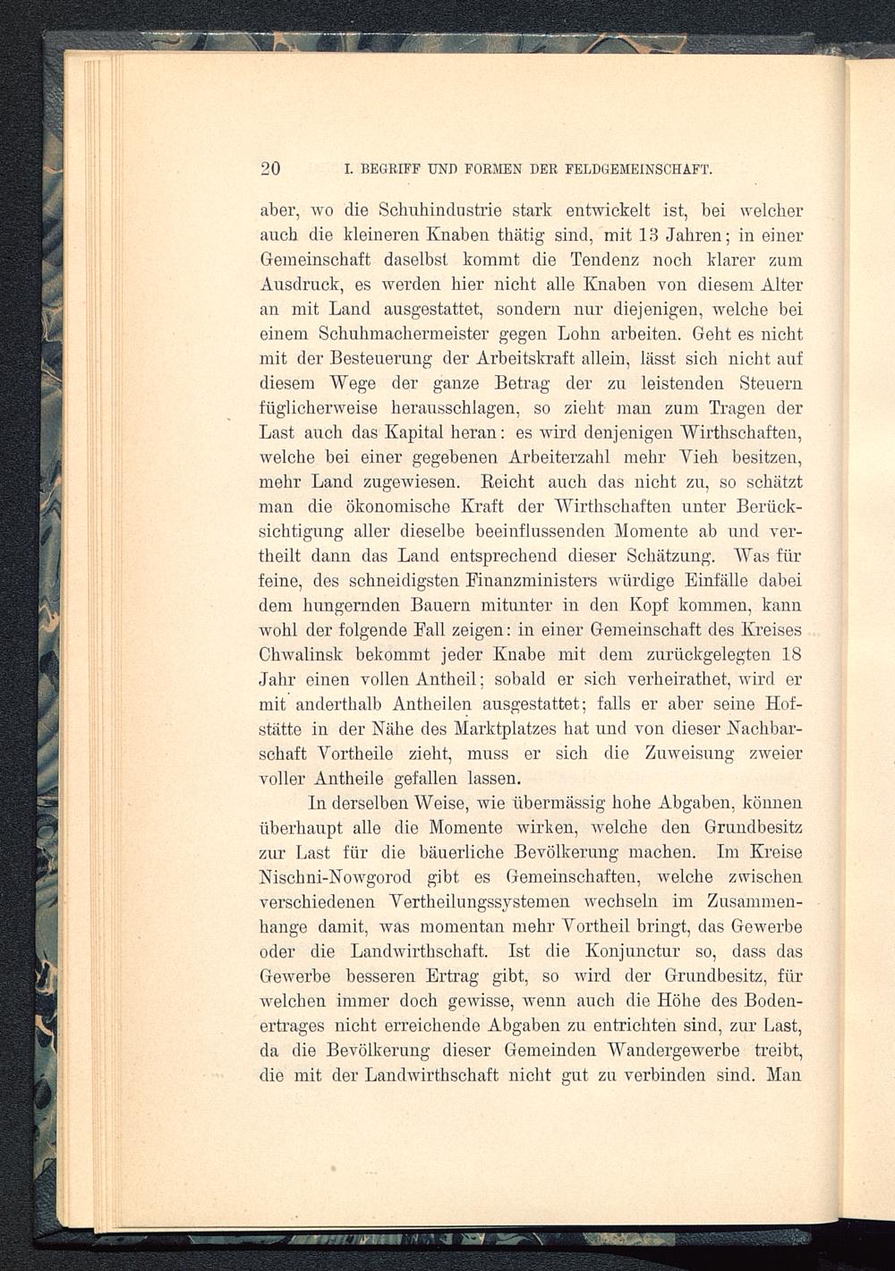 aber, wo die Schuhindustrie stark entwickelt ist, bei welcherauch die kleineren Knaben thätig sind, mit 18 Jahren; in einerGemeinschaft daselbst kommt die Tendenz noch klarer zumAusdruck, es werden hier nicht alle Knaben von diesem Alteran mit Land ausgestattet, sondern nur diejenigen, welche beieinem Schuhmachermeister gegen Lohn arbeiten. Geht es nichtmit der Besteuerung der Arbeitskraft allein, lässt sich nicht aufdiesem Wege der ganze Betrag der zu leistenden Steuernfüglicherweise herausschlagen, so zieht man zum Tragen derLast auch das Kapital heran: es wird denjenigen Wirthschaften,welche bei einer gegebenen Arbeiterzahl mehr Vieh besitzen,mehr Land zugewiesen. Reicht auch das nicht zu, so schätztman die ökonomische Kraft der Wirthschaften unter Berück-sichtigung aller dieselbe beeinflussenden Momente ab und ver-theilt dann das Land entsprechend dieser Schätzung. Was fürfeine, des schneidigsten Finanzministers würdige Einfälle dabeidem hungernden Bauern mitunter in den Kopf kommen, kannwohl der folgende Fall zeigen: in einer Gemeinschaft des KreisesChwalinsk bekommt jeder Knabe mit dem zurückgelegten 18Jahr einen vollen Antheil; sobald er sich verheirathet, wird ermit anderthalb Antheilen ausgestattet; falls er aber seine Hof-stätte in der Nähe des Marktplatzes hat und von dieser Nachbar-schaft Vortheile zieht, muss er sich die Zuweisung zweiervoller Antheile gefallen lassen.