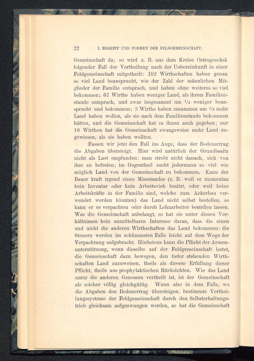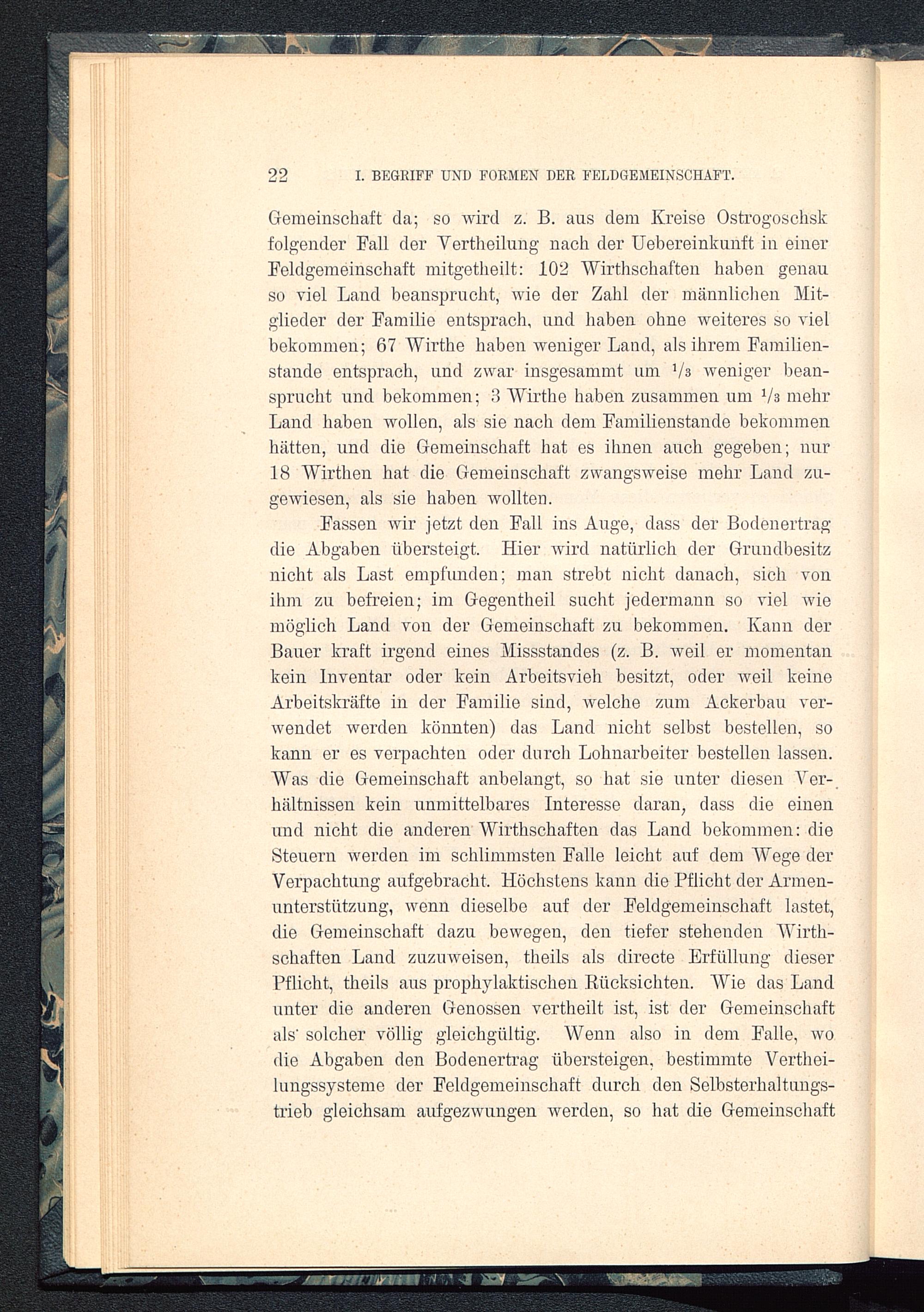 Fassen wir jetzt den Fall ins Auge, dass der Bodenertragdie Abgaben übersteigt. Hier wird natürlich der Grundbesitznicht als Last empfunden; man strebt nicht danach, sich vonihm zu befreien; im Gegentheil sucht jedermann so viel wiemöglich Land von der Gemeinschaft zu bekommen. Kann derBauer kraft irgend eines Missstandes (z. B. weil er momentankein Inventar oder kein Arbeitsvieh besitzt, oder weil keineArbeitskräfte in der Familie sind, welche zum Ackerbau ver-wendet werden könnten) das Land nicht selbst bestellen, sokann er es verpachten oder durch Lohnarbeiter bestellen lassen.Was die Gemeinschaft anbelangt, so hat sie unter diesen Ver-hältnissen kein unmittelbares Interesse daran, dass die einenund nicht die anderen Wirthschaften das Land bekommen: dieSteuern werden im schlimmsten Falle leicht auf dem Wege derVerpachtung aufgebracht. Höchstens kann die Pflicht der Armen-unterstützung, wenn dieselbe auf der Feldgemeinschaft lastet,die Gemeinschaft dazu bewegen, den tiefer stehenden Wirth-schaften Land zuzuweisen, theils als directe Erfüllung dieserPflicht, theils aus prophylaktischen Rücksichten. Wie das Landunter die anderen Genossen vertheilt ist, ist der Gemeinschaftals' solcher völlig gleichgültig. Wenn also in dem Falle, wodie Abgaben den Bodenertrag übersteigen, bestimmte Verthei-lungssysteme der Feldgemeinschaft durch den Selbsterhaltungs-trieb gleichsam aufgezwungen werden, so hat die Gemeinschaft