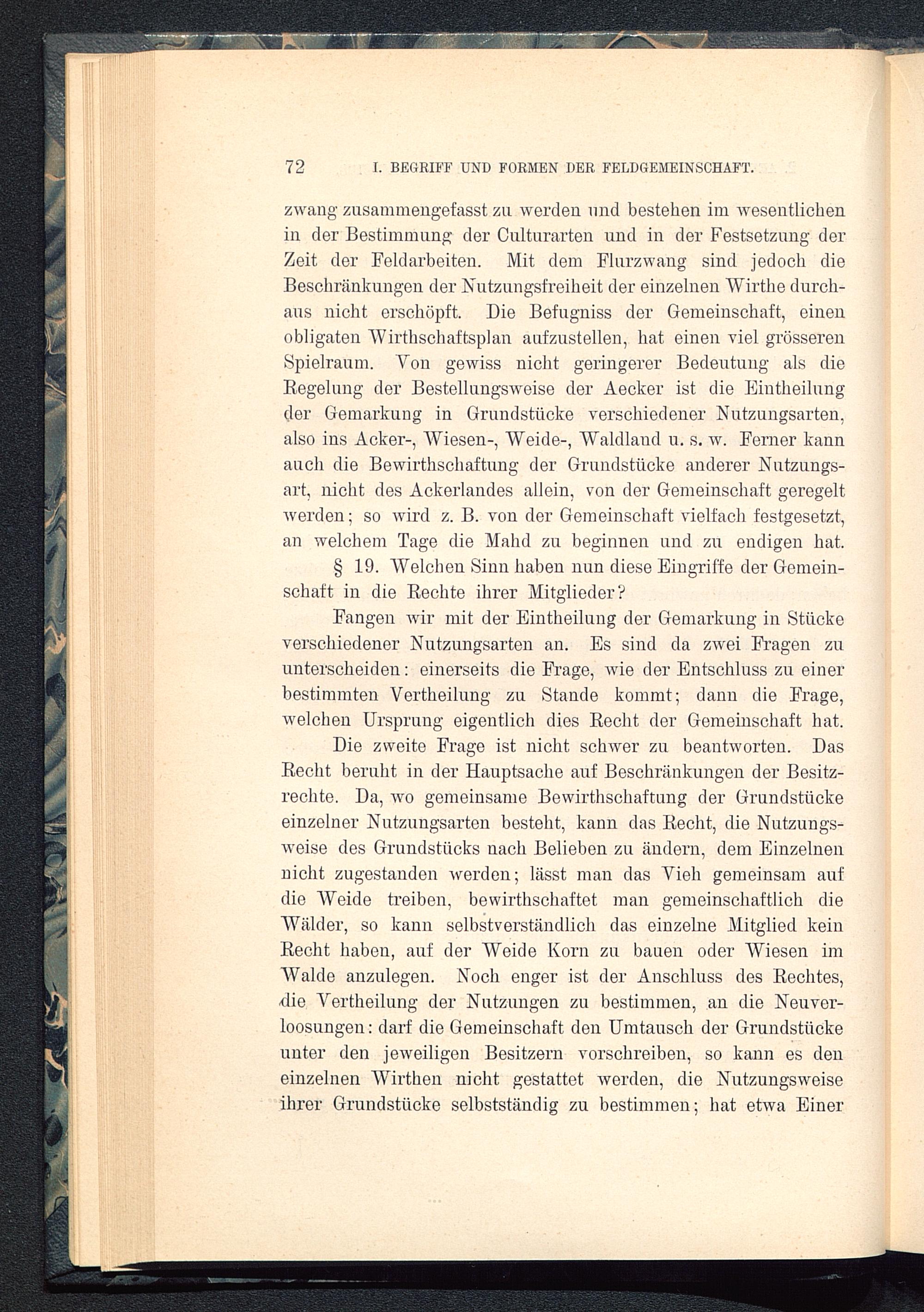 Fangen wir mit der Eintheilung der Gemarkung in Stückeverschiedener Nutzungsarten an. Es sind da zwei Fragen zuunterscheiden: einerseits die Frage, wie der Entschluss zu einerbestimmten Vertheilung zu Stande kommt; dann die Frage,welchen Ursprung eigentlich dies Recht der Gemeinschaft hat.