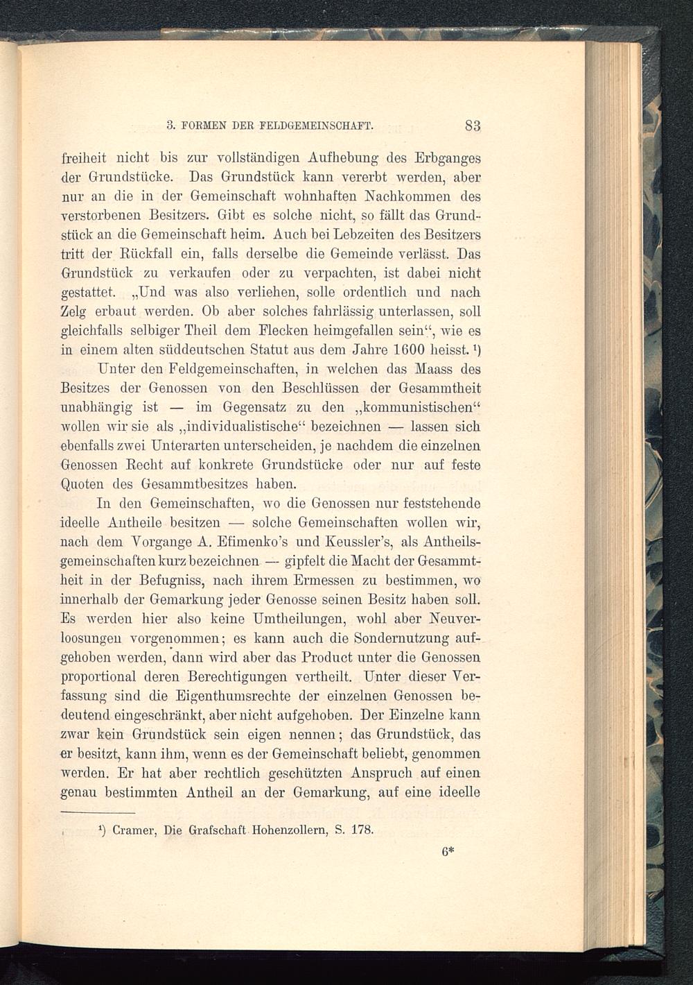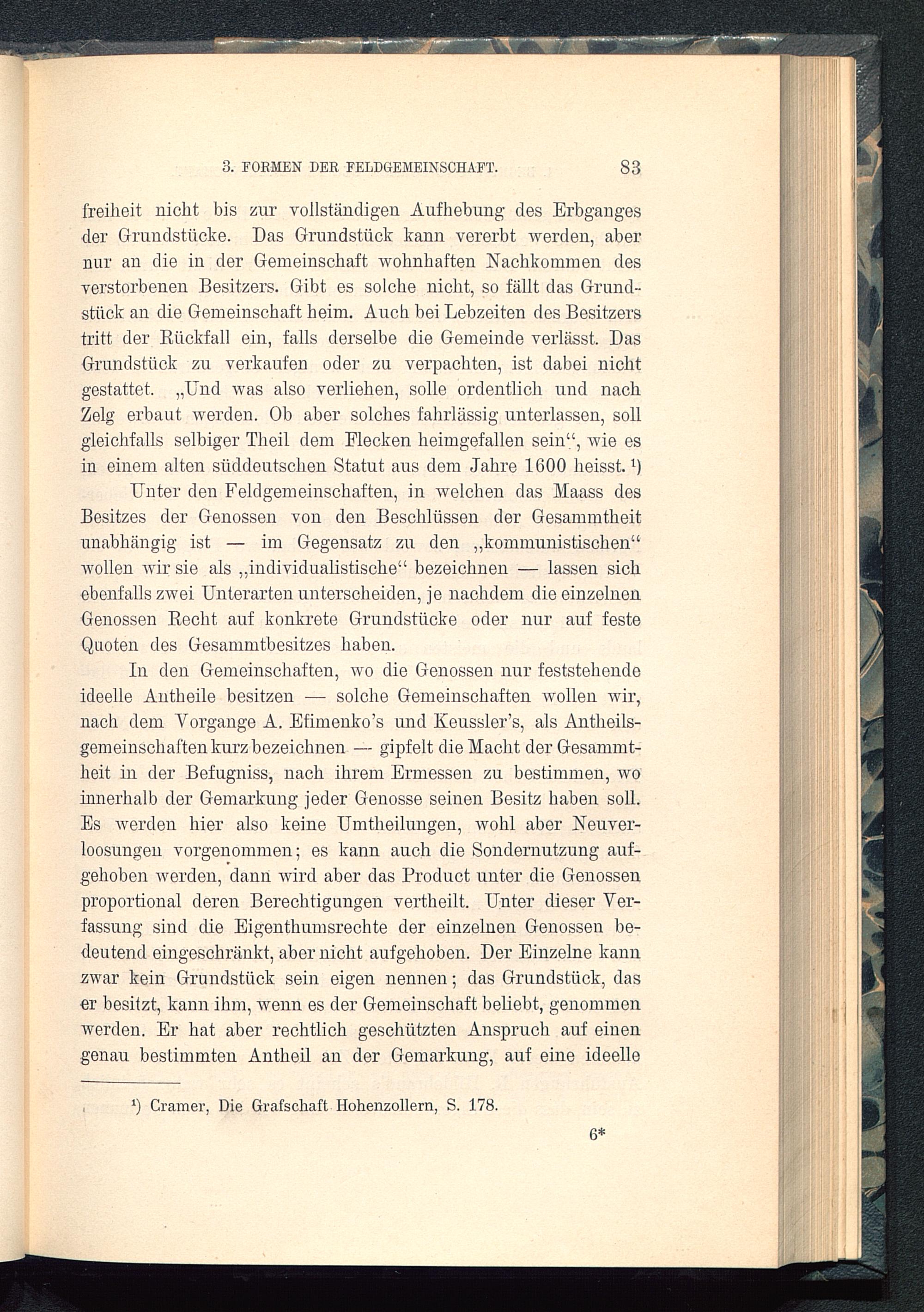 In den Gemeinschaften, wo die Genossen nur feststehendeideelle Antheile besitzen — solche Gemeinschaften wollen wir,nach dem Vorgänge A. Efimenko’s und Keussler’s, als Antheils-gemeinschaften kurz bezeichnen — gipfelt die Macht der Gesammt-heit in der Befugniss, nach ihrem Ermessen zu bestimmen, woinnerhalb der Gemarkung jeder Genosse seinen Besitz haben soll.Es werden hier also keine Umtheilungen, wohl aber Neuver-loosungen vorgenommen; es kann auch die Sondernutzung auf-gehoben werden, dann wird aber das Product unter die Genossenproportional deren Berechtigungen vertheilt. Unter dieser Ver-fassung sind die Eigenthumsrechte der einzelnen Genossen be-deutend eingeschränkt, aber nicht aufgehoben. Der Einzelne kannzwar kein Grundstück sein eigen nennen; das Grundstück, daser besitzt, kann ihm, wenn es der Gemeinschaft beliebt, genommenwerden. Er hat aber rechtlich geschützten Anspruch auf einengenau bestimmten Antheil an der Gemarkung, auf eine ideelle