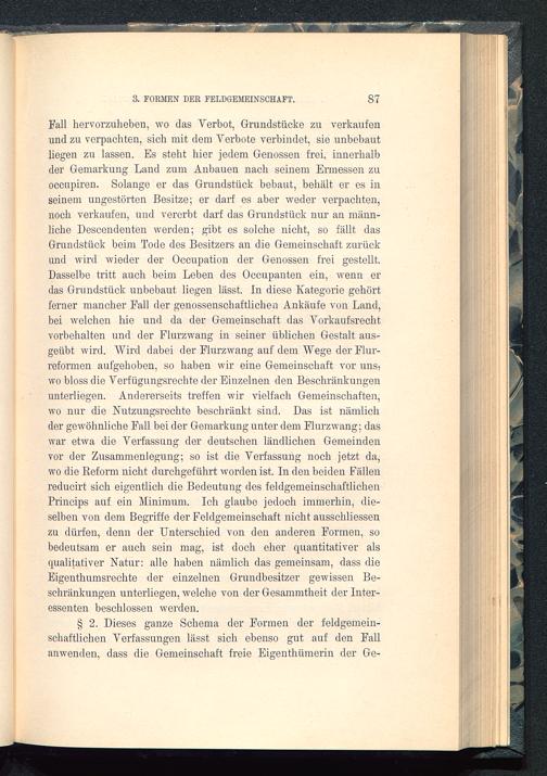 Fall hervorzuheben, wo das Yerbot, Grundstücke zu verkaufenund zu verpachten, sich mit dem Yerbote verbindet, sie unbebautliegen zn lassen. Es steht hier jedem Genossen frei, innerhalbder Gemarkung Land zum Anbauen nach seinem Ermessen zuoccupiren. Solange er das Grundstück bebaut, behält er es inseinem ungestörten Besitze; er darf es aber weder verpachten,noch verkaufen, und vererbt darf das Grundstück nur an männ-liche Descendenten werden; gibt es solche nicht, so fällt dasGrundstück beim Tode des Besitzers an die Gemeinschaft zurückund wird wieder der Occupation der Genossen frei gestellt.Dasselbe tritt auch beim Leben des Occupanten ein, wenn erdas Grundstück unbebaut liegen lässt. In diese Kategorie gehörtferner mancher Fall der genossenschaftlichen Ankäufe von Land,bei welchen hie und da der Gemeinschaft das VorkaufsrechtVorbehalten und der Flurzwang in seiner üblichen Gestalt aus-geübt wird. Wird dabei der Flurzwang auf dem Wege der Flur-reformen aufgehoben, so haben wir eine Gemeinschaft vor unsjwo bloss die Verfügungsrechte der Einzelnen den Beschränkungenunterliegen. Andererseits treffen wir vielfach Gemeinschaften,wo nur die Nutzungsrechte beschränkt sind. Das ist nämlichder gewöhnliche Fall bei der Gemarkung unter dem Flurzwang; daswar etwa die Verfassung der deutschen ländlichen Gemeindenvor der Zusammenlegung; so ist die Verfassung noch jetzt da,wo die Reform nicht durchgeführt worden ist. In den beiden Fällenreducirt sich eigentlich die Bedeutung des feldgemeinschaftlichenPrincips auf ein Minimum. Ich glaube jedoch immerhin, die-selben von dem Begriffe der Feldgemeinschaft nicht ausschliessenzu dürfen, denn der Unterschied von den anderen Formen, sobedeutsam er auch sein mag, ist doch eher quantitativer alsqualitativer Natur: alle haben nämlich das gemeinsam, dass dieEigenthumsrechte der einzelnen Grundbesitzer gewissen Be-schränkungen unterliegen, welche von der Gesammtheit der Inter-essenten beschlossen werden.