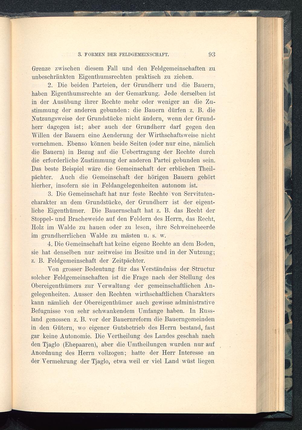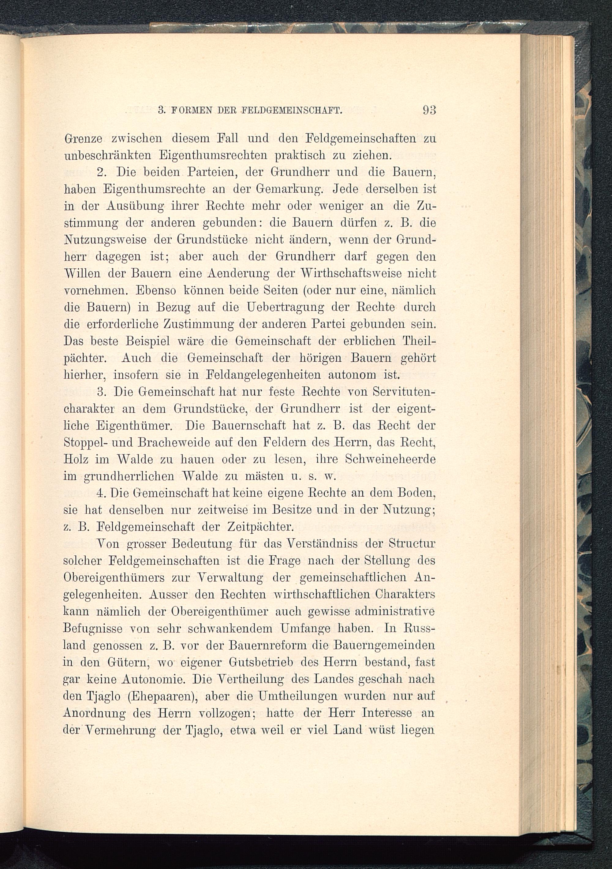 Yon grosser Bedeutung für das Verständniss der Structursolcher Feldgemeinschaften ist die Frage nach der Stellung desObereigenthümers zur Verwaltung der gemeinschaftlichen An-gelegenheiten. Ausser den Rechten wirtlischaftlichen Charakterskann nämlich der Obereigenthümer auch gewisse administrativeBefugnisse von sehr schwankendem Umfange haben. In Russ-land genossen z. B. vor der Bauernreform die Bauerngemeindenin den Gütern, wo eigener Gutsbetrieb des Herrn bestand, fastgar keine Autonomie. Die Yertheilung des Landes geschah nachden Tjaglo (Ehepaaren), aber die Umtheilungen wurden nur aufAnordnung des Herrn vollzogen; hatte der Herr Interesse ander Vermehrung der Tjaglo, etwa weil er viel Land wüst liegen