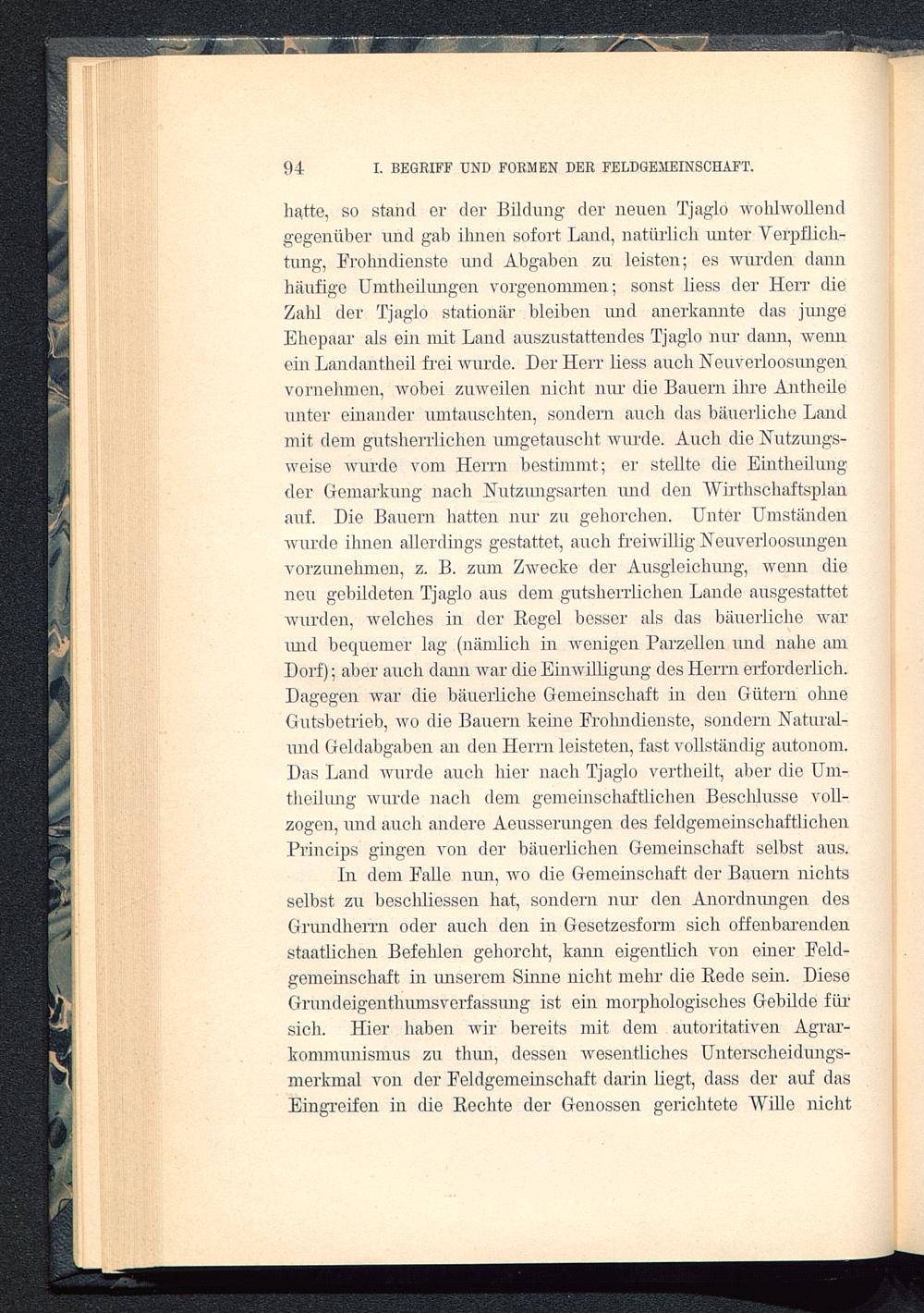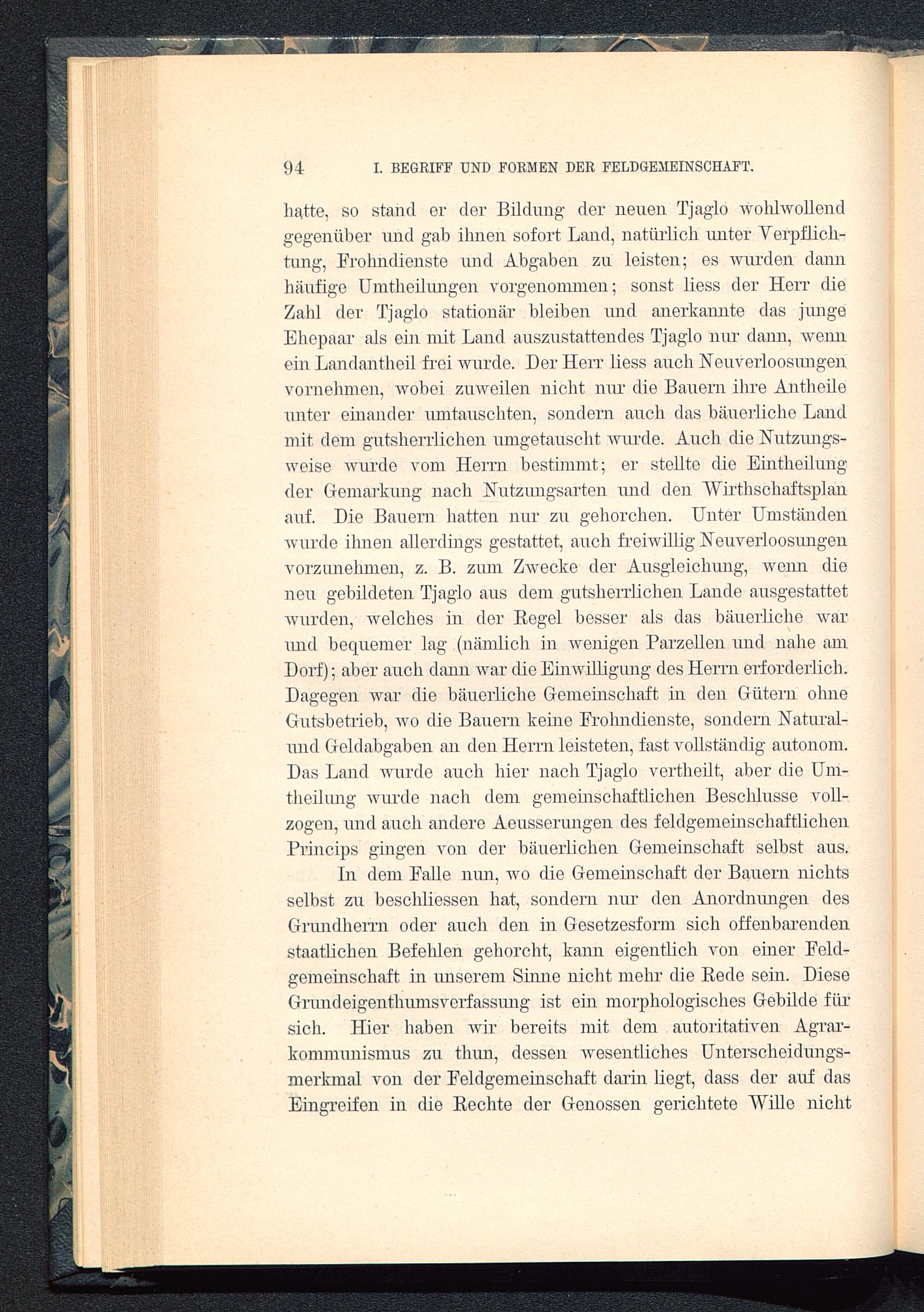 In dem Palle nun, avo die Gemeinschaft der Bauern nichtsselbst zu beschliessen hat, sondern nur den Anordnungen desGrundherrn oder auch den in Gesetzesform sich offenbarendenstaatlichen Befehlen gehorcht, kann eigentlich von einer Feld-gemeinschaft in unserem Sinne nicht mehr die Rede sein. DieseGrundeigenthumsverfassung ist ein morphologisches Gebilde fürsich. Hier haben wir bereits mit dem autoritativen Agrar-kommunismus zu thun, dessen Avesentliches Unterscheidungs-merkmal von der Feldgemeinschaft darin liegt, dass der auf dasEingreifen in die Rechte der Genossen gerichtete "Wille nicht