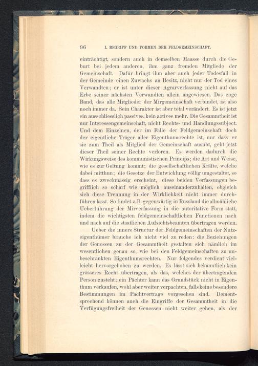 einträchtigt, sondern auch in demselben Maasse durch die Ge-burt bei jedem anderen, ihm ganz fremden Mitgliedo derGemeinschaft. Dafür bringt ihm aber auch jeder Todesfall inder Gemeinde einen Zuwachs an Besitz, nicht nur der Tod eines"Verwandten; er ist unter dieser Agrarverfassung nicht auf dasErbe seiner nächsten Verwandten allein angewiesen. Das engeBand, das alle Mitglieder der Mirgemeinschaft verbindet, ist alsonoch immer da. Sein Charakter ist aber total verändert. Es ist jetztein ausschliesslich passives, kein actives mehr. Die Gesannntheit istnur Interessengemeinschaft, nicht Rechts- und Handlungssubject.Und dem Einzelnen, der im Falle der Feldgemeinschaft dochder eigentliche Träger aller Eigenthumsrechte ist, nur dass ersie zum Theil als Mitglied der Gemeinschaft ausübt, geht jetztdieser Theil seiner Rechte verloren. Es werden dadurch dieWirkimgsweise des kommunistischen Princips; die Art und Weise,wie es zur Geltung kommt; die gesellschaftlichen Kräfte, welchedabei mitthun; die Gesetze der Entwicklung völlig umgestaltet, sodass es zweckmässig erscheint, diese beiden Verfassungen be-grifflich so scharf wie möglich auseinanderzuhalten, obgleichsich diese Trennung in der Wirklichkeit nicht immer durch-führen lässt. So findet z.B. gegenwärtig in Russland die allmählicheUeberführung der Mirverfassung in die autoritative Form statt,indem die wichtigsten feldgemeinschaftlichen Functionen nachund nach auf die staatlichen Aufsichtsbeamten übertragen werden.