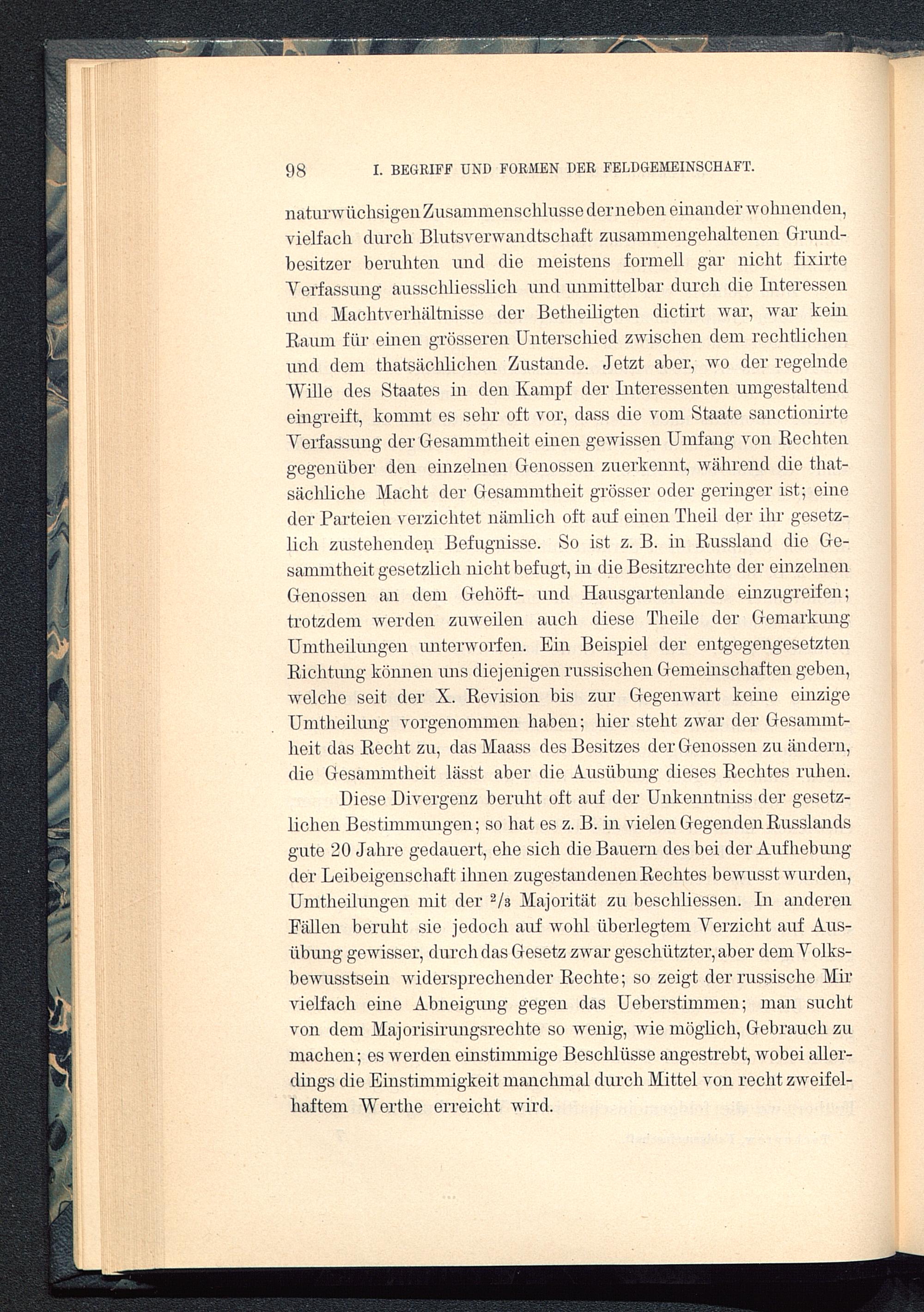 naturwüchsigen Zusammenschlüsse clerneben einander wohnenden,vielfach durch Blutsverwandtschaft zusammengehaltenen Grund-besitzer beruhten und die meistens formell gar nicht fixirteVerfassung ausschliesslich undunmittelbar durch die Interessenund Machtverhältnisse der Betheiligten dictirt war, war keinRaum für einen grösseren Unterschied zwischen dem rechtlichenund dem thatsiichlichen Zustande. Jetzt aber, wo der regelndeWille des Staates in den Kampf der Interessenten umgestaltendeingreift, kommt es sehr oft vor, dass die vom Staate sanctionirtoVerfassung der Gesannntheit einen gewissen Umfang von Rechtengegenüber den einzelnen Genossen zuerkennt, während die tliat-sächliche Macht der Gesannntheit grösser oder geringer ist; eineder Parteien verzichtet nämlich oft auf einen Theil der ihr gesetz-lich zustehenden Befugnisse. So ist z. B. in Russland die Ge-sannntheit gesetzlich nicht befugt, in die Besitzrechte der einzelnenGenossen an dem Gehöft- und Hausgartenlande einzugreifen;trotzdem werden zuweilen auch diese Theile der GemarkungUmtheilungen unterworfen. Ein Beispiel der entgegengesetztenRichtung können uns diejenigen russischen Gemeinschaften geben,welche seit der X. Revision bis zur Gegenwart keine einzigeUmtheiliuig vorgenommen haben; hier steht zwar der Gesannnt-heit das Recht zu, dasMaass des Besitzes der Genossen zu ändern,die Gesannntheit lässt aber die Ausübung dieses Rechtes ruhen.
