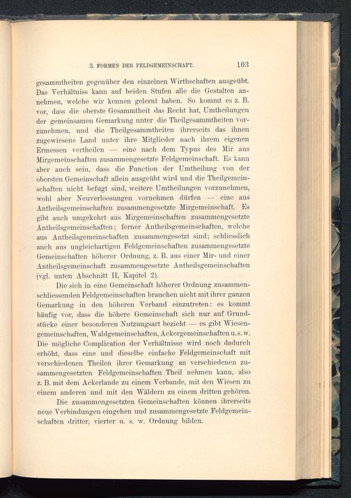 gesammtheiten gegenüber den einzelnen Wirthschaften ausgeübt.Das Yerbältniss kann anf beiden Stufen alle die Gestalten an-nelimen, welche wir kennen gelernt haben. So kommt es z. ß.vor, dass die oberste Gesammtheit das Recht hat, Umtheilungender gemeinsamen Gemarkung unter die Theilgesammtheiten vor-zunelnnen, und die Theilgesammtheiten ihrerseits das ihnenzugewiesene Land unter ihre Mitglieder nach ihrem eigenenErmessen vertheilen — eine nach dem Typus des Mir ausMirgemeinschaften zusammengesetzte Feldgemeinschaft. Es kannaber auch sein, dass die Function der Umtheilung von derobersten Gemeinschaft allein ausgeübt wird und die Theilgemein-schaften nicht befugt sind, weitere Umtheilungen vorzunehmen,wohl aber Neuverloosungen vornehmen dürfen — eine ausAntheilsgemeinschaften zusammengesetzte Mirgemeinschaft. Esgibt auch umgekehrt aus Mirgemeinschaften zusammengesetzteAntheilsgemeinschaften; ferner Antheilsgemeinschaften, welcheaus Antheilsgemeinschaften zusammengesetzt sind; schliesslichauch aus ungleichartigen Feldgemeinschaften zusammengesetzteGemeinschaften höherer Ordnung, z. B. aus einer Mir- und einerAntheilsgemeinschaft zusammengesetzte Antheilsgemeinschaften(vgl. unten Abschnitt II, Kapitel 2).