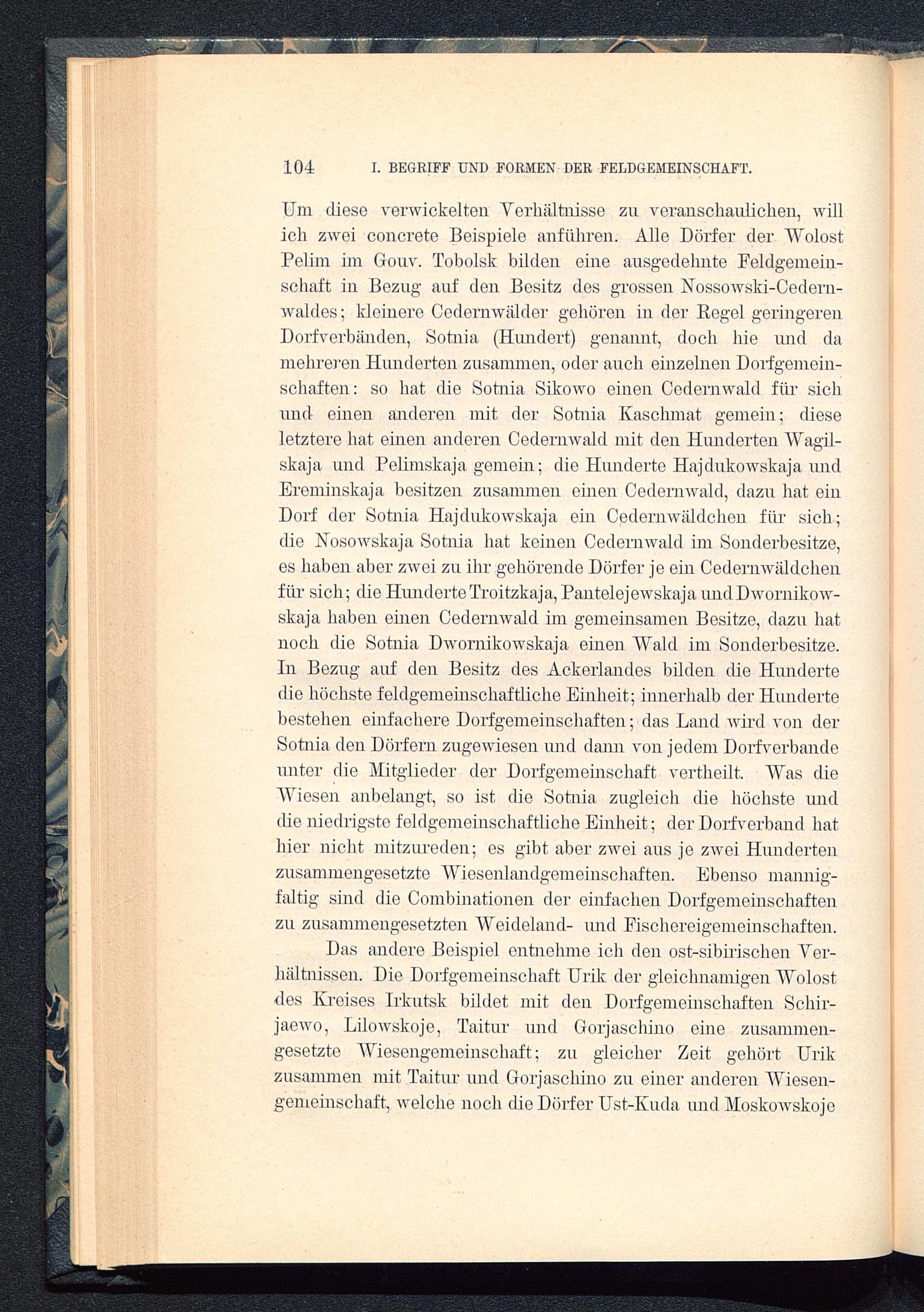 Um diese verwickelten Verhältnisse zn veranschaulichen, willich zwei concrete Beispiele anführen. Alle Dörfer der WolostPelim im Gouv. Tobolsk bilden eine ausgedehnte Feldgemein-schaft in Bezug auf den Besitz des grossen Nossowski-Cedern-waldes; kleinere Cedernwälder gehören in der Regel geringerenDorfverbänden, Sotnia (Hundert) genannt, doch hie und damehreren Hunderten zusammen, oder auch einzelnen Dorfgemein-schaften: so hat die Sotnia Sikowo einen Cedernwald für sichund einen anderen mit der Sotnia Kaschmat gemein; dieseletztere hat einen anderen Cedernwald mit den Hunderten AVagil-skaja und Pelimskaja gemein; die Hunderte Hajdukowskaja undErominskaja besitzen zusammen einen Cedernwald, dazu hat einDorf der Sotnia Hajdukowskaja ein Cedernwäldchen für sich;die Nosowskaja Sotnia hat keinen Cedernwald im Sonderbesitze,es haben aber zwei zu ihr gehörende Dörfer je ein Cedernwäldchenfür sich; die HunderteTroitzkaja, Pantelejewskaja undDwornikow-skaja haben einen Cedernwald im gemeinsamen Besitze, dazu hatnoch die Sotnia Dwornikowskaja einen Wald im Sonderbesitze.In Bezug auf den Besitz des Ackerlandes bilden die Hundertedie höchste feldgemeinschaftliche Einheit; innerhalb der Hundertebestehen einfachere Dorfgemeinschaften; das Land wird von derSotnia den Dörfern zugewiesen und dann von jedem Dorfverbandeunter die Mitglieder der Dorfgemeinschaft vertheilt. Was dieAViesen anbelangt, so ist die Sotnia zugleich die höchste unddie niedrigste feldgemeinschaftliche Einheit; der Dorfverband hathier nicht mitzureden; es gibt aber zwei aus je zwei Hundertenzusammengesetzte AViesenlandgemeinschaften. Ebenso mannig-faltig sind die Combinationen der einfachen Dorfgemeinschaftenzu zusammengesetzten AVeideland- und Eischereigemeinschaften.