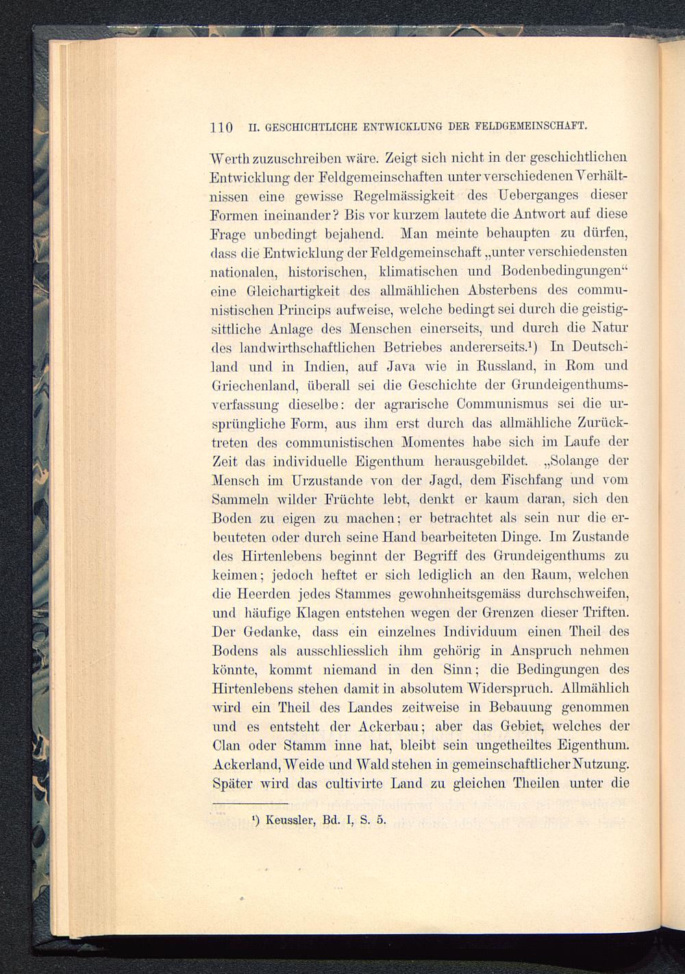"Werth zuzuschreiben wäre. Zeigt sich nicht in der geschichtlichenEntwicklung der Feldgemeinschaften unter verschiedenen Verhält-nissen eine gewisse Regelmässigkeit des Ueberganges dieserFormen ineinander? Eis vor kurzem lautete die Antwort auf dieseFrage unbedingt bejahend. Man meinte behaupten zu dürfen,dass die Entwicklung der Feldgemeinschaft „unter verschiedenstennationalen, historischen, klimatischen und Bodenbedingungen“eine Gleichartigkeit des allmählichen Absterbens des comnni-nistischen Brincips aufweise, welche bedingt sei durch die geistig-sittliche Anlage des Menschen einerseits, und durch die Naturdes landwirtschaftlichen Betriebes andererseits. 1 ) In Deutsch-land und in Indien, auf Java wie in Russland, in Rom undGriechenland , überall sei die Geschichte der Grundeigentliums-verfassung dieselbe: der agrarische Comnnmismus sei die ur-sprüngliche Form, aus ihm erst durch das allmähliche Zurück-treten des communistischen Momentes habe sich im Laufe derZeit das individuelle Eigentum, herausgebildet. „Solange derMensch im Urzustände von der Jagd, dem Fischfang und vomSammeln wilder Früchte lebt, denkt er kaum daran, sich denBoden zu eigen zu machen; er betachtet als sein nur die er-beuteten oder durch seine Hand bearbeiteten Dinge. Im Zustandedes Hirtenlebens beginnt der Begriff des Grundeigentums zukeimen; jedoch heftet er sich lediglich an den Raum, welchendie Heerden jedes Stammes gewohnheitsgemäss durchschweifen,und häufige Klagen entstehen wegen der Grenzen dieser Triften.Der Gedanke, dass ein einzelnes Individuum einen Theil desBodens als ausschliesslich ihm gehörig in Anspruch nehmenkönnte, kommt niemand in den Sinn; die Bedingungen desHirtenlebens stehen damit in absolutem Widerspruch. Allmählichwird ein Theil des Landes zeitweise in Behauung genommenund es entsteht der Ackerbau; aber das Gebiet, welches derClan oder Stamm inne hat, bleibt sein ungeteiltes Eigentum.Ackerland, Weide und Wald stehen in gemeinschaftlicher Nutzung.Später wird das cultivirte Land zu gleichen Theilen unter die