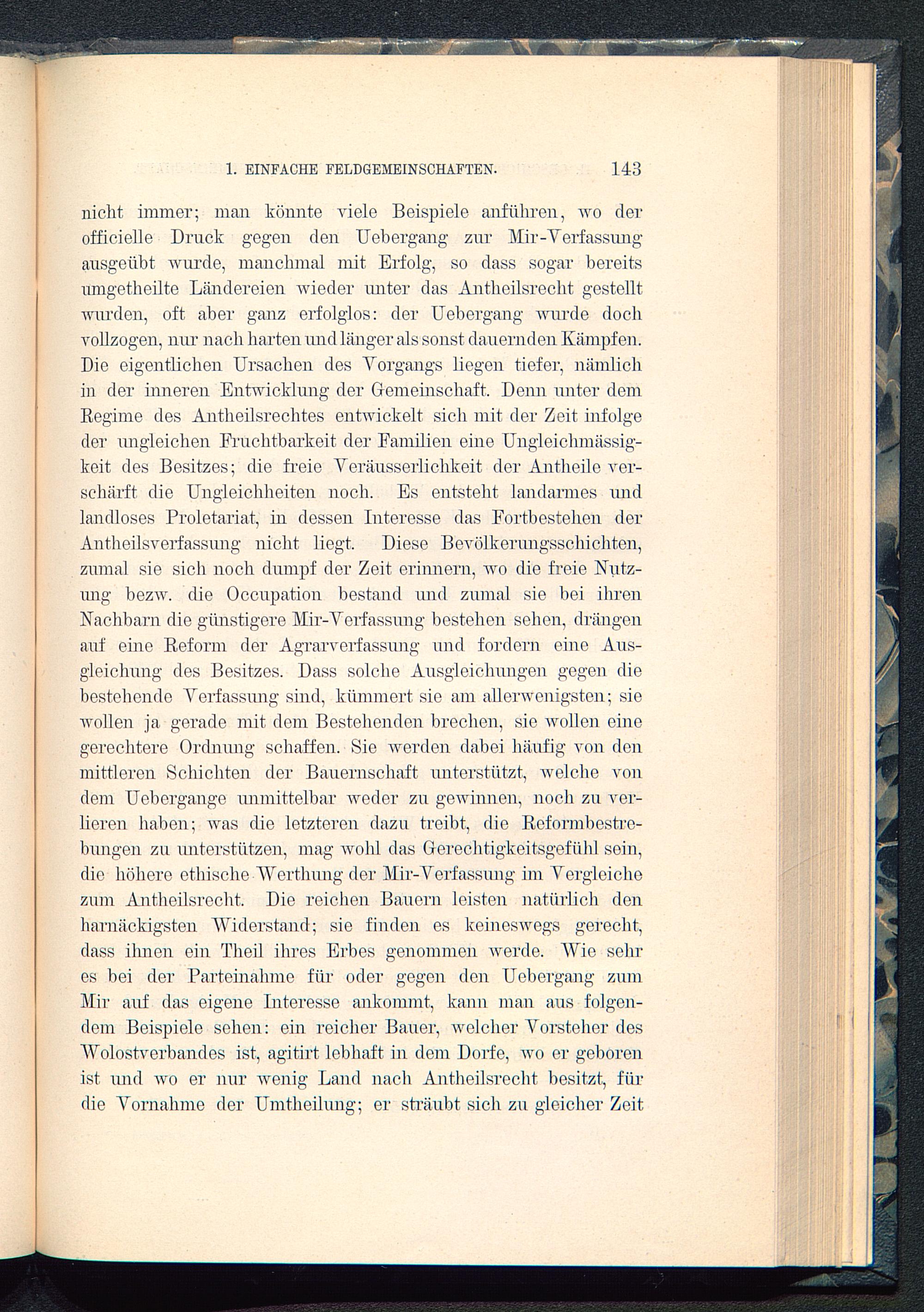 nicht immer; man könnte viele Beispiele anführen, wo derofficielle Druck gegen den Uebergang zur Mir-Verfassungausgeübt wurde, manchmal mit Erfolg, so dass sogar bereitsumgetheilte Ländereien wieder unter das Antheilsreclit gestelltwurden, oft aber ganz erfolglos: der Uebergang wurde dochvollzogen, nur nach harten und länger als sonst dauernden Kämpfen.Die eigentlichen Ursachen des Vorgangs liegen tiefer, nämlichin der inneren Entwicklung der Gemeinschaft. Denn unter demRegime des Antlieilsrechtes entwickelt sich mit der Zeit infolgeder ungleichen Fruchtbarkeit der Familien eine Ungleiclnnässig-keit des Besitzes; die freie Veräusserlichkeit der Antheile ver-schärft die Ungleichheiten noch. Es entsteht landarmes midlandloses Proletariat, in dessen Interesse das Fortbestehen derAntheilsverfassung nicht liegt. Diese Bevölkerungsschichten,zumal sie sich noch dumpf der Zeit erinnern, wo die freie Nutz-ung bezw. die Occupation bestand und zumal sie hei ihrenNachbarn die günstigere Mir-Verfassung bestehen sehen, drängenauf eine Reform der Agrarverfassung und fordern eine Aus-gleichung des Besitzes. Dass solche Ausgleichungen gegen diebestehende Verfassung sind, kümmert sie am allerwenigsten; siewollen ja gerade mit dem Bestehenden brechen, sie wollen einegerechtere Ordnung schaffen. Sie werden dabei häufig von denmittleren Schichten der Bauernschaft unterstützt, welche vondem Uebergange unmittelbar weder zu gewinnen, noch zu ver-lieren haben; was die letzteren dazu treibt, die Reformbestre-bungen zu unterstützen, mag Avohl das Gerechtigkeitsgefühl sein,die höhere ethische Wertlmng der Mir-Verfassung im Vergleichezum Antheilsreclit. Die reichen Bauern leisten natürlich denharnäckigsten Widerstand; sie finden es keinesivegs gerecht,dass ihnen ein Tlieil ihres Erbes genommen Averde. Wie sehres bei der Parteinahme für oder gegen den Uebergang zumMir auf das eigene Interesse ankommt, kann man aus folgen-dem Beispiele sehen: ein reicher Bauer, Avelcher Vorsteher desWolostverbandes ist, agitirt lebhaft in dem Dorfe, avo er geborenist und avo er nur Avenig Land nach Antheilsreclit besitzt, fürdie Vornahme der Umtheilung; er sträubt sich zu gleicher Zeit