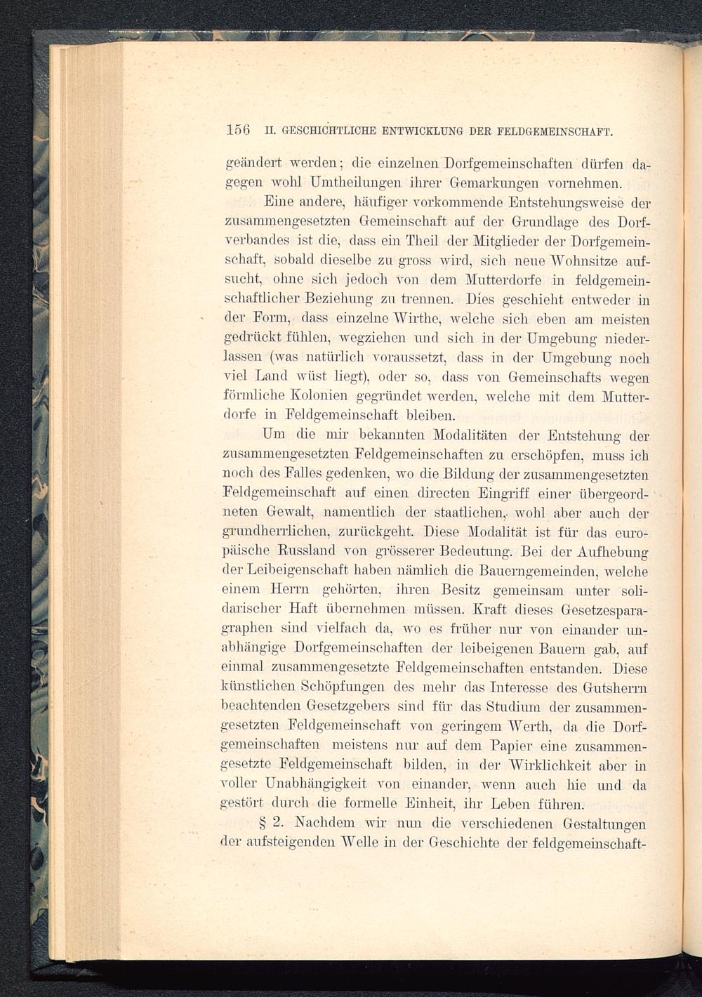 Eine andere, häufiger vorkommende Entstehungsweise derzusammengesetzten Gemeinschaft auf der Grundlage des Dorf-verbandes ist die, dass ein Tlieil der Mitglieder der Dorfgemein-schaft, sobald dieselbe zu gross wird, sich neue "Wohnsitze auf-sucht, ohne sich jedoch von dem Mutterdorfe in feldgemein-schaftlicher Beziehung zu trennen. Dies geschieht entweder inder Form, dass einzelne Wirthc, welche sich eben am meistengedrückt fühlen, wegziehen und sich in der Umgebung nieder-lassen (was natürlich voraussetzt, dass in der Umgebung nochviel Land wüst liegt), oder so, dass von Gemeinschafts wegenförmliche Kolonien gegründet werden, welche mit dem Mutter-dorfe in Feldgemeinschaft bleiben.