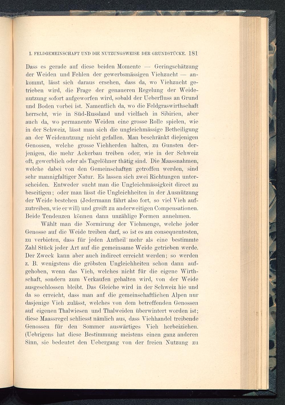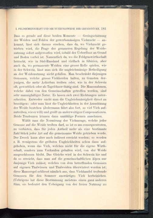 Dass es gerade auf diese beiden Momente — Geringschätzungder Weiden und Fehlen der gewerbsmässigen Viehzucht — an-kommt, lässt sich daraus ersehen, dass da, avo Viehzucht ge-trieben AA'ird, die Frage der genaueren Regelung der Woide-nutzung sofort aufgeivorfen wird, sobald der Ueberfluss an Grundund Boden vorbei ist. Namentlich da, avo die FeldgrasAvirthschaftherrscht, Avie in Süd-Russland und vielfach in Sibirien , aberauch da, avo permanente Weiden eine grosse Rolle spielen, AA r iein der Sclnveiz, lässt man sich die ungleichmässige Betheiligungan der Weidenutzung nicht gefallen. Man beschränkt diejenigenGenossen, rvelche grosse Viehherden halten, zu Gunsten der-jenigen, die mehr Ackerbau treiben oder, Avie in der Sclnveizoft, geAverblich oder als Tagelöhner thätig sind. Die Maassnahmen,Avelche dabei von den Gemeinschaften getroffen Averden, sindsehr mannigfaltiger Natur. Es lassen sich zAvei Richtungen unter-scheiden. Entweder sucht man die Ungleichmässigkeit direct zubeseitigen; oder man lässt die Ungleichheiten in der Ausnützungder Weide bestehen (Jedermann fährt also fort, so viel Vieh auf-zutreiben, AvieerAA'ill) und greift zu anderAveitigenCompensationen.Beide Tendenzen können dann unzählige Formen annehmen.