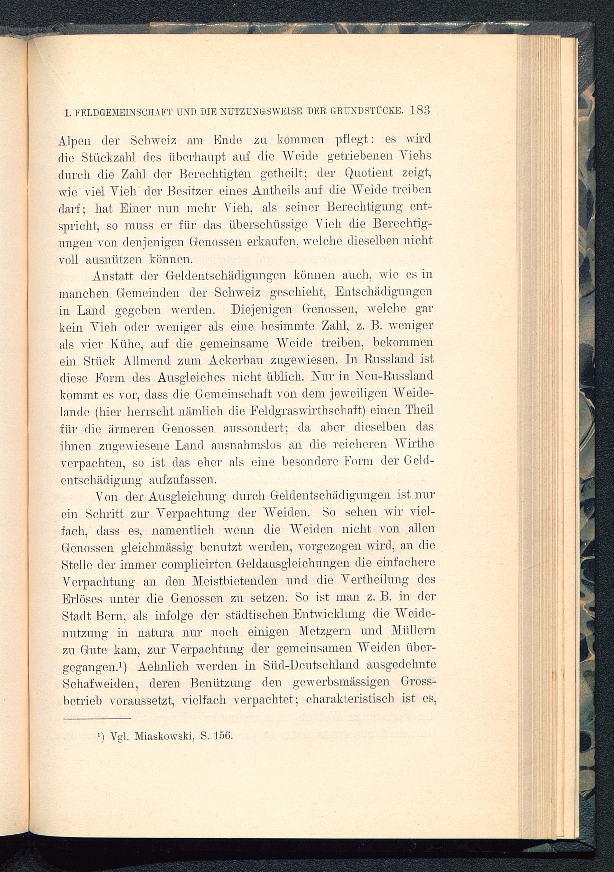 Von der Ansgleichung durch Geldentschädigungen ist nurein Schritt zur Verpachtung der Weiden . So sehen wir viel-fach, dass es, namentlich wenn die Weiden nicht von allenGenossen gleichmässig benutzt werden, vorgezogen wird, an cheStelle der immer complicirten Geldausgleichungen die einfachereVerpachtung an den Meistbietenden und die Vertheilung desErlöses unter die Genossen zu setzen. So ist man z. B. in derStadt Bern , als infolge der städtischen Entwicklung die Weide-nutzung in natura nur noch einigen Metzgern und Müllernzu Gute kam, zur Verpachtung der gemeinsamen Weiden über-gegangen. 1 ) Aelmlich werden in Süd-Deutschland ausgedehnteSchafweiden, deren Benützung den gewerbsmässigen Gross-betrieb voraussetzt, vielfach verpachtet; charakteristisch ist es,