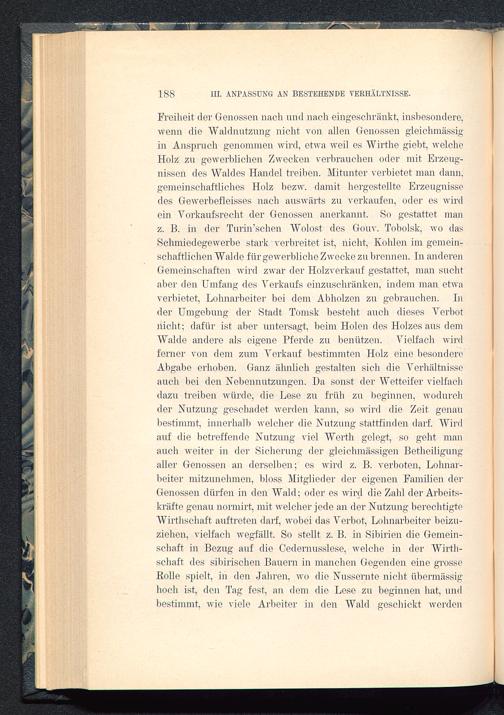 Freiheit, der Genossen nach und nach eingeschränkt, insbesondere,wenn die Waldnutzung nicht von allen Genossen gleiclnnässigin Anspruch genommen wird, etwa weil es Wirthe giebt, welcheHolz zu gewerblichen Zwecken verbrauchen oder mit Erzeug-nissen des Waldes Handel treiben. Mitunter verbietet man dann,gemeinschaftliches Holz bezw. damit hergestellte Erzeugnissedes Gewerbefleisses nach auswärts zu verkaufen, oder es wirdein Vorkaufsrecht der Genossen anerkannt. So gestattet mauz. B. in der Turin’schen Wolost des Gouv. Tobolsk , wo dasSchmiedegewerbe stark verbreitet ist, nicht, Kohlen im gemein-schaftlichen Walde für gewerbliche Zwecke zu brennen. In anderenGemeinschaften wird zwar der Holzverkauf gestattet, man suchtaber den Umfang des Verkaufs einzuschränken, indem man etwaverbietet, Lohnarbeiter bei dem Abholzen zu gebrauchen. Inder Umgebung der Stadt Tomsk besteht auch dieses Verbotnicht; dafür ist aber untersagt, beim Holen des Holzes aus demWalde andere als eigene Pferde zu benützen. Vielfach wirdferner von dem zum Verkauf bestimmten Holz eine besondereAbgabe erhoben. Ganz älmlich gestalten sich die Verhältnisseauch bei den Nebennutzungen. Da sonst der Wetteifer vielfachdazu treiben würde, die Lese zu früh zu beginnen, wodurchder Nutzung geschadet werden kann, so wird die Zeit genaubestimmt, innerhalb welcher die Nutzung stattfinden darf. Wirdauf die betreffende Nutzung Adel Werth gelegt, so geht manauch weiter in der Sicherung der gleiehmässigen Betheiligungaller Genossen an derselben; es wird z. B. verboten, Lohnar-beiter mitzunehmen, bloss Mitglieder der eigenen Familien derGenossen dürfen in den Wald; oder es wird die Zahl der Arbeits-kräfte genau normirt, mit welcher jede an der Nutzung berechtigteWirthschaft. auftreten darf, wobei das Verbot, Lohnarbeiter beizu-ziehen, vielfach wegfällt. So stellt z. B. in Sibirien die Gemein-schaft in Bezug auf die Cedernusslese, welche in der Wirth-schaft des sibirischen Bauern in manchen Gegenden eine grosseRolle spielt, in den Jahren, wo die Nussernte nicht übermässighoch ist, den Tag fest, an dem die Lese zu beginnen hat, undbestimmt, wie viele Arbeiter in den Wald geschickt werden
