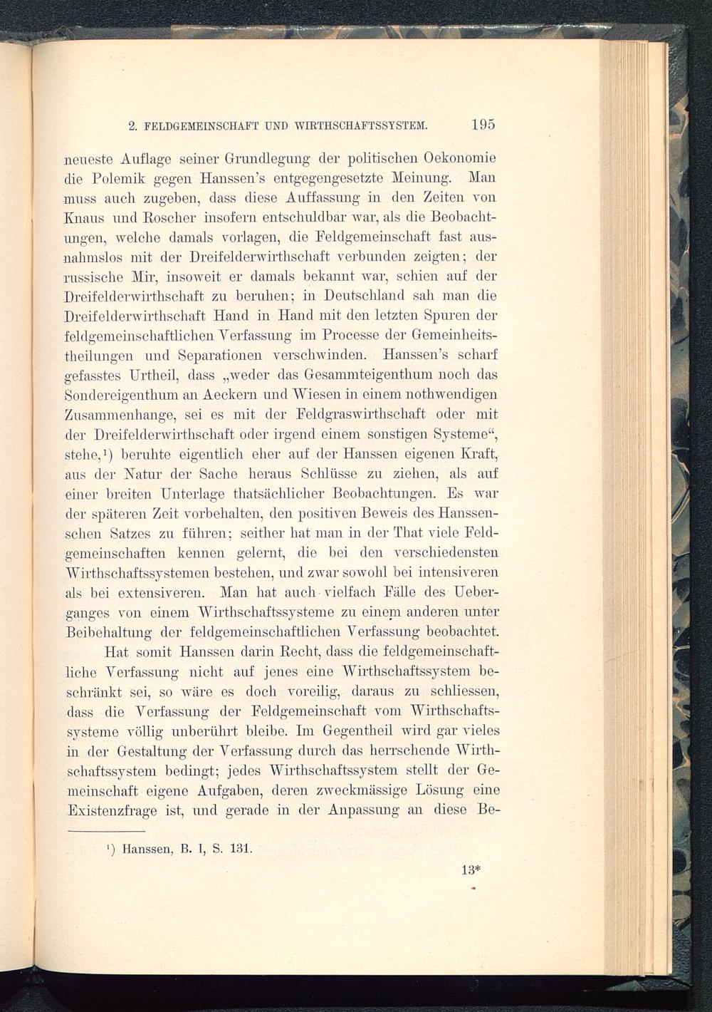 neueste Auflage seiner Grundlegung der politischen Oekonomiedie Polemik gegen Hanssen’s entgegengesetzte Meinung. Manmuss auch zugehen, dass diese Auffassung in den Zeiten vonKnaus und Roscher insofern entschuldbar war, als die Beobacht-ungen, welche damals Vorlagen, che Feldgemeinschaft fast aus-nahmslos mit der Dreifelderwirthschaft verbunden zeigten; derrussische Mir, insoweit er damals bekannt war, schien auf derDreifelderwirthschaft zu beruhen; in Deutschland sah man dieDreifelderwirthschaft Hand in Hand mit den letzten Spuren derfeldgemeinschaftlichen Verfassung im Processe der Gemeinheits-theilungen und Separationen verschwinden. Hanssen’s scharfgefasstes Urtheil, dass „weder das Gesammteigentlium noch dasSondereigenthum an Aeckern und Wiesen in einem nothwendigenZusammen hange, sei es mit der Feldgraswirthschaft oder mitder Dreifelderwirthschaft oder irgend einem sonstigen Systeme“,stehe, 1 ) beruhte eigentlich eher auf der Hanssen eigenen Kraft,aus der Natur der Sache heraus Schlüsse zu ziehen, als aufeiner breiten Unterlage thatsächlicher Beobachtungen. Es warder späteren Zeit Vorbehalten, den positiven Beweis des Hanssen-schen Satzes zu führen; seither hat man in der Thal viele Feld-gemeinschaften kennen gelernt, die hei den verschiedenstenWirthschaftssystemen bestehen, und zwar sowohl hei intensiverenals bei extensiveren. Man hat auch vielfach Fälle des Ueber-ganges von einem Wirthschaftssjmteme zu eineni anderen unterBeibehaltung der feldgemeinschaftlichen Verfassung beobachtet.