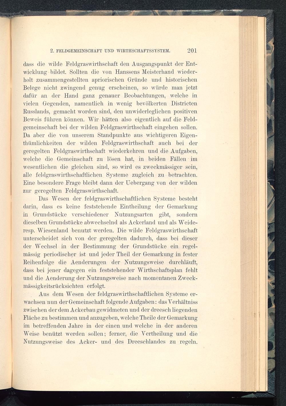 Das Wesen der feldgraswirthschaftlichen Systeme bestehtdarin, dass es keine feststehende Eintheilung der Gemarkungin Grundstücke verschiedener Nutzungsarten gibt, sonderndieselben Grundstücke abwechselnd als Ackerland und als Weide-resp. Wiesenland benutzt Averden. Die Avilde FeldgrasAvirthschaftunterscheidet sich von der geregelten dadurch, dass bei dieserder Wechsel in der Bestimmung der Grundstücke ein regel-mässig periodischer ist und jeder Theil der Gemarkung in festerReihenfolge die Aenderungen der Nutzungsweise durchläuft,dass bei jener dagegen ein feststehender Wirthschaftsplan fehltund die Aenderung der NutzungsAveise nach momentanen ZAveck-mässigkeitsrücksichten erfolgt.