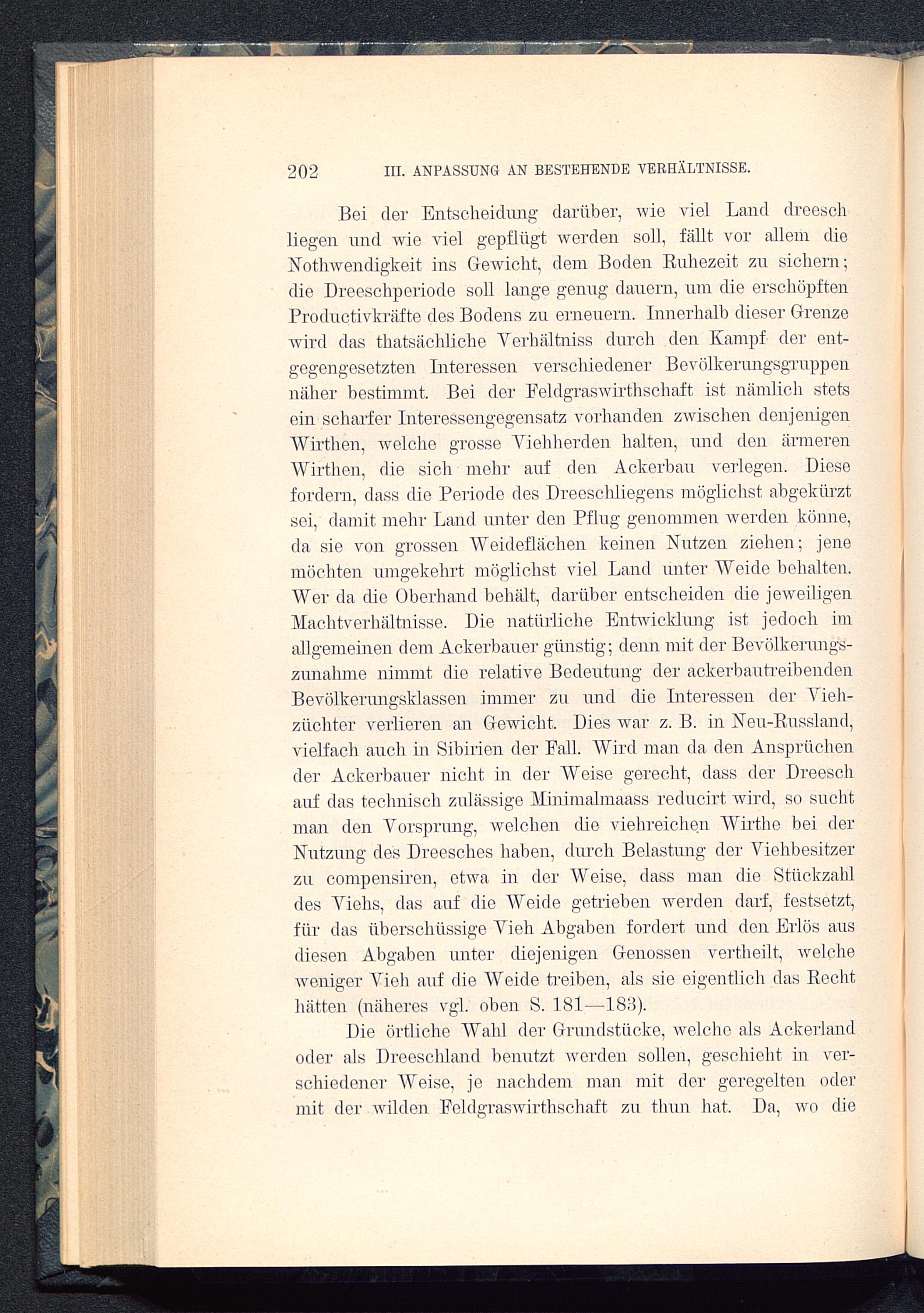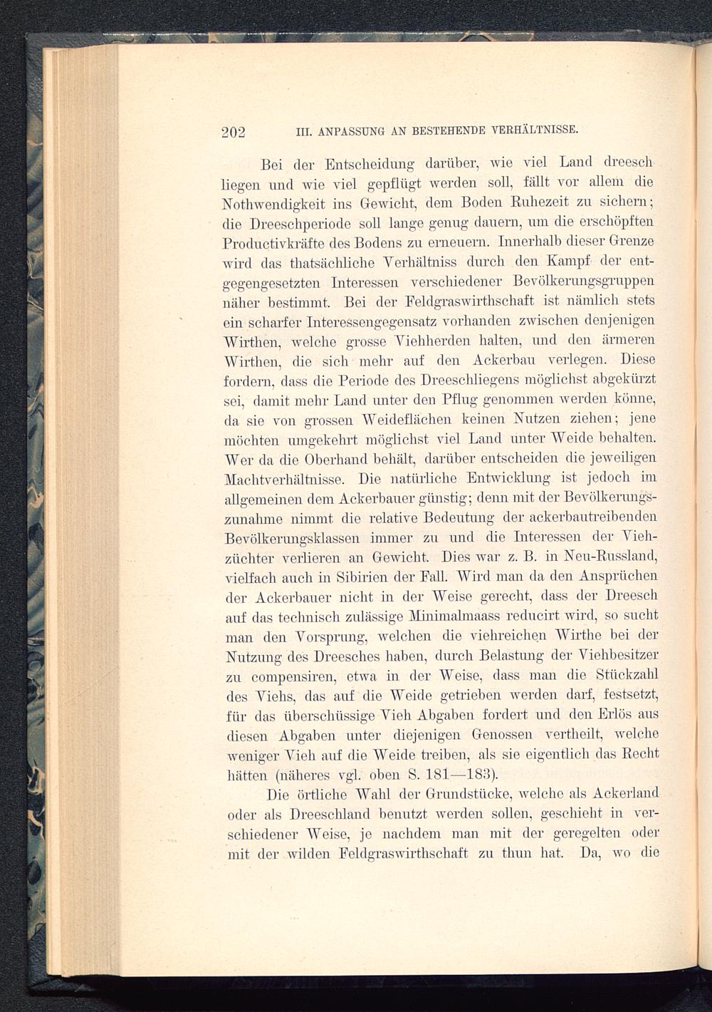 Boi der Entscheidung darüber, wie viel Land dreeschliegen und wie viel gepflügt werden soll, fällt vor allem dieNothwendigkeit ins Gewicht, dem Boden Ruhezeit zu sichern;die Dreeschperiode soll lange genug dauern, um die erschöpftenProductivkräfte des Bodens zu erneuern. Innerhalb dieser Grenzewird das thatsächliche Verhältniss durch den Kampf der ent-gegengesetzten Interessen verschiedener Bevölkerungsgruppennäher bestimmt. Bei der Eeldgraswirthschaft ist nämlich stetsein scharfer Interessengegensatz vorhanden zwischen denjenigenWirthen, welche grosse Yiehherden halten, und den ärmerenWirthen, die sich mehr auf den Ackerbau verlegen. Diesefordern, dass die Periode des Dreeschliegens möglichst abgekürztsei, damit mehr Land unter den Pflug genommen werden könne,da sie von grossen Weideflächen keinen Nutzen ziehen; jenemöchten umgekehrt möglichst viel Land unter Weide behalten.Wer da die Oberhand behält, darüber entscheiden die jeweiligenAlachtverhältnisse. Die natürliche Entwicklung ist jedoch imallgemeinen dem Ackerbauer günstig; denn mit der Bevölkerungs-zunahme nimmt die relative Bedeutung der ackerbautreibendenBevölkerungsklassen immer zu und die Interessen der Vieh-züchter verlieren an Gewicht, Dies war z. B. in Neu-Russland,vielfach auch in Sibirien der Fall. Wird man da den Ansprüchender Ackerbauer nicht in der Weise gerecht, dass der Dreeschauf das technisch zulässige Alinimalmaass reducirt. ivird, so suchtman den Vorsprung, welchen die viehreichen Wirthe bei derNutzung des Dreesches haben, durch Belastung der Viehbesitzerzu compensiren, etwa in der Weise, dass man die Stückzahldes Viehs, das auf die Weide getrieben werden darf, festsetzt,für das überschüssige Vieh Abgaben fordert und den Erlös ausdiesen Abgaben unter diejenigen Genossen vertheilt, welcheweniger Vieh auf die Weide treiben, als sie eigentlich das Rechthätten (näheres vgl. oben S. 181—18)1).