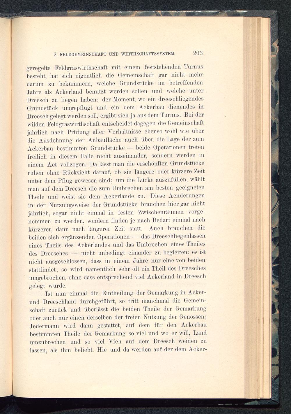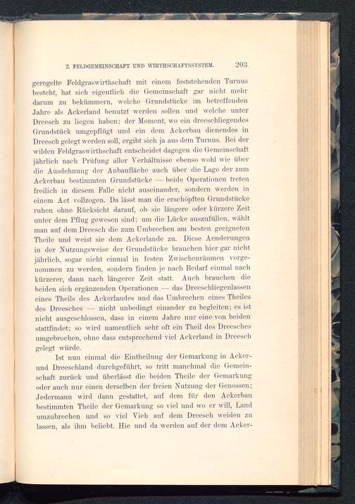 Tst nun einmal die Eintheilnng der Gemarkung in Acker-und Dreeschland durchgeführt, so tritt manchmal die Gemein-schaft zurück und überlässt die beiden Tlieile der Gemarkungoder auch nur einen derselben der freien Nutzung der Genossen;Jedermann wird dann gestattet, auf dem für den Ackerbaubestimmten Tlieile der Gemarkung so viel und wo er will, Landumzubrechen und so viel Vieh auf dem Dreesch weiden zulassen, als ihm beliebt. Hie und da werden auf der dem Acker-