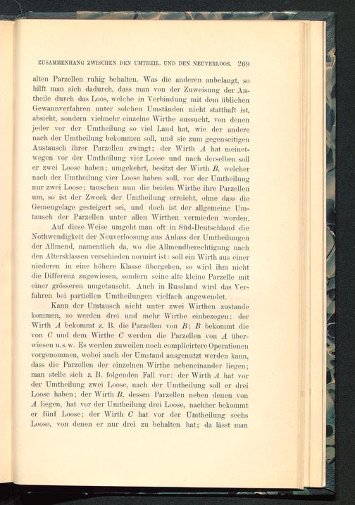 alten Parzellen ruhig behalten. Was die anderen anbelangt, sohilft man sich dadurch, dass man von der Zuweisung der An-tlieile durch das Loos, Avelche in Verbindung mit dem üblichenGewannverfahren unter solchen Umständen nicht statthaft ist,absieht, sondern vielmehr einzelne Wirthe aussucht, von denenjeder vor der Umtheilung so viel Land hat, wie der anderenach der Umtheilung bekommen soll, und sie zum gegenseitigenAustausch ihrer Parzellen zwingt; der Wirtli A hat meinet-wegen vor der Umtheilung vier Loose und nach derselben soller zwei Loose haben; umgekehrt, besitzt der Wirtli B, welchernach der Umtheilung vier Loose haben soll, vor der Umtheilungnur zwei Loose; tauschen nun die beiden Wirthe ihre Parzellenum, so ist der Zweck der Umtheilung erreicht, ohne dass dieGemengelage gesteigert sei, und doch ist der allgemeine Um-tausch der Parzellen unter allen Wirthen vermieden worden.