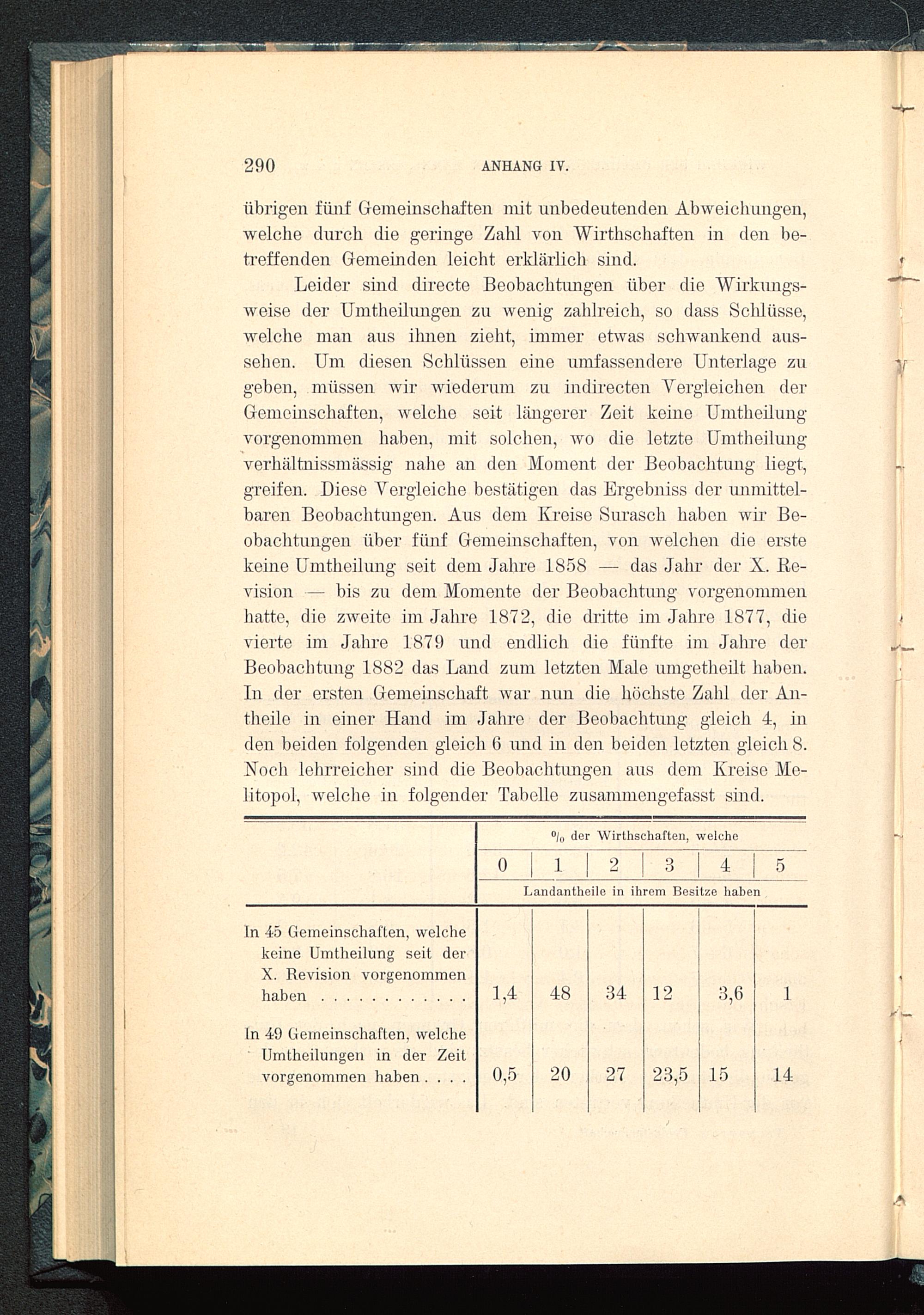 Leider sind directe Beobachtungen über die Wirkungs-weise der Umtheilungen zu wenig zahlreich, so dass Schlüsse,welche man aus ihnen zieht, immer etwas schwankend aus-sehen. Um diesen Schlüssen eine umfassendere Unterlage zugeben, müssen wir wiederum zu indirecten Vergleichen derGemeinschaften, welche seit längerer Zeit keine Umtheilungvorgenommen haben, mit solchen, wo die letzte Umtheilungverhältnissmässig nahe an den Moment der Beobachtung liegt,greifen. Diese Vergleiche bestätigen das Ergebniss der unmittel-baren Beobachtungen. Aus dem Kreise Surasch haben wir Be-obachtungen über fünf Gemeinschaften, von welchen die erstekeine Umtheilung seit dem Jahre 1858 — das Jahr der X. Ke-vision — bis zu dem Momente der Beobachtung vorgenommenhatte, die zweite im Jahre 1872, die dritte im Jahre 1877, dievierte im Jahre 1879 und endlich die fünfte im Jahre derBeobachtung 1882 das Land zum letzten Male umgetheilt haben.In der ersten Gemeinschaft war nun die höchste Zahl der An-theile in einer Hand im Jahre der Beobachtung gleich 4, inden beiden folgenden gleich 6 und in den beiden letzten gleich 8.Noch lehrreicher sind die Beobachtungen aus dem Kreise Me-litopol, welche in folgender Tabelle zusammengefasst sind.
