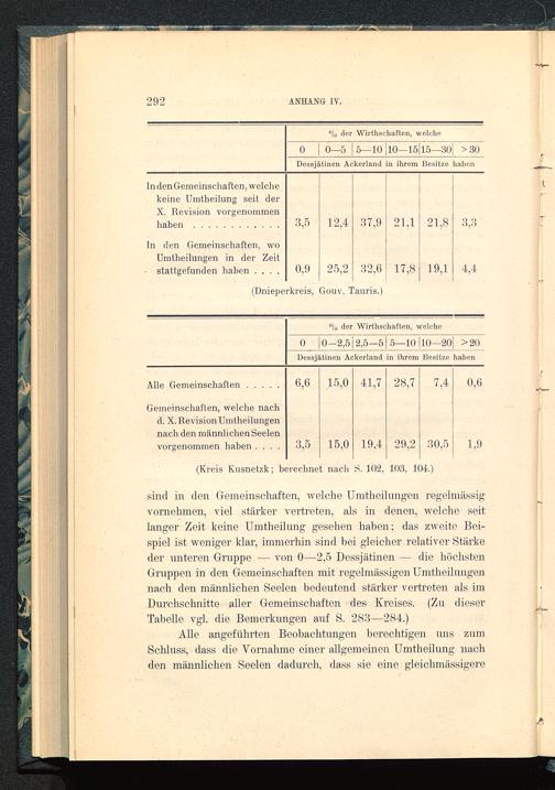 sind in den Gemeinschaften, welche Umtheilnngen regelmässig’vornehmen, viel stärker vertreten, als in denen, welche seitlanger Zeit keine Umtheilung gesehen haben; das ZAveite Bei-spiel ist weniger klar, immerhin sind bei gleicher relativer Stärkeder unteren Gruppe — von 0—2,5 Dessjätinen — die höchstenGruppen in den Gemeinschaften mit regelmässigen Umtheilnngennach den männlichen Seelen bedeutend stärker vertreten als imDurchschnitte aller Gemeinschaften des Kreises. (Zu dieserTabelle vgl. die Bemerkungen auf S. 283—284.)