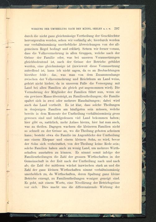 durch die nicht ganz gleichmäßige Vertheilung der Geschlechterhervorgerufen werden, sehen wir vorläufig ab; hierdurch werdennur verhältnissmässig unerhebliche Abweichungen von der all-gemeinen Regel bedingt und erklärt). Setzen wir ferner voraus,dass die Volksvermehrung in allen Gruppen, welche nach derGrösse der Familie oder, was bei unseren Voraussetzungengleichbedeutend ist, nach der Grösse der Betriebe gebildetwerden, eine gleickmässige ist (inwieweit diese Voraussetzungzutreffend ist, kann ich nicht sagen, da es an Beobachtungenhierüber fehlt; das, was man von dem Zusammenhängezwischen der Volksvermehrung und Reichthum an Land weiss,gehört nicht hieb er, da in unserem Falle die Versorgung mitLand bei allen Familien als gleich gut angenommen wird). DieVermehrung der Mitglieder der Familien führt nun, wenn sieein gewisses Maass übersteigt, zu Familientheilungen; die Familiespaltet sich in zwei oder mehrere Haushaltungen; dabei wirdauch das Land vertheilt. Es ist klar, dass solche Theihmgenin denjenigen Familien am häufigsten sein müssen, welchebereits in dem Momente der Umtheilung verhältnissmässig grossgewesen sind und infolgedessen viel Land bekommen haben;hier gibt es, natürlich, mehr Anlass hierzu, hier hat man auch,was zu theilen. Dagegen wachsen die kleineren Familien nichtso schnell zu der Grösse an, wo die Theilung geboten scheinenkann; besteht etwa die Familie im Augenblicke der Umtheilungaus einem Ehepaar und einem kleinen Sohn, so wird, bevorder Sohn sich verheirathet, von der Theilung keine Rede sein;solche Familien haben auch zu wenig Land, um mehrere Wirth-schaften ausstatten zu können. Es nimmt somit infolge derFamilientheilungen die Zahl der grossen Wirtschaften in derGemeinschaft in der Zeit nach der Umtheilung nach und nachab; die Zahl der mittleren wächst inzwischen stark an und dieZahl der ganz kleinen Wirthschaften nimmt verhältnissmässigunerheblich zu, da Wirthschaften, deren Spaltung ganz kleineBetriebe erzeugt, zu Familientheilungen weniger geneigt sind.Es geht, mit einem Worte, eine Nivellirung der Betriebsgrössevor sich. Dies macht uns die differenzirende Wirkung der