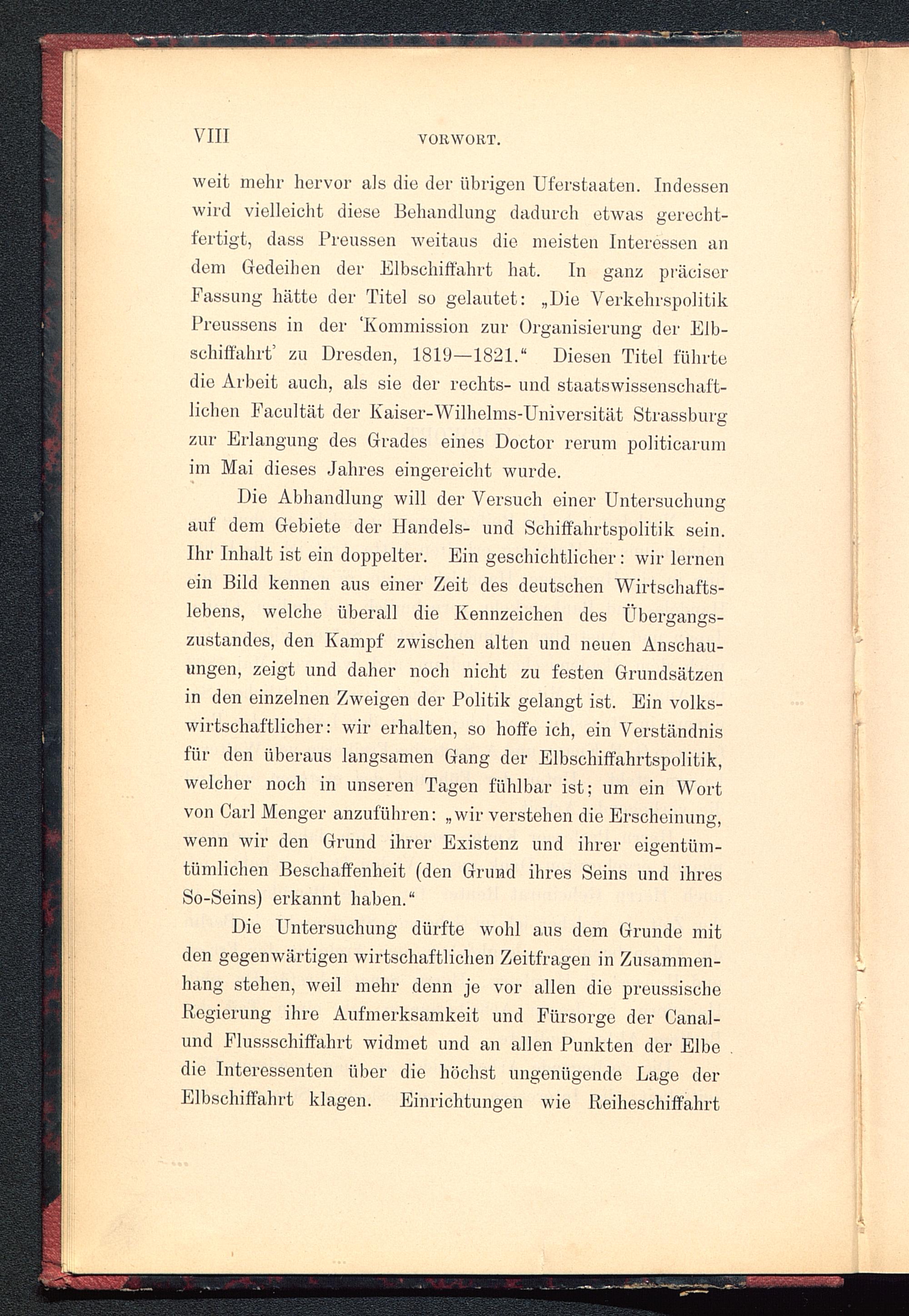 die Arbeit auch, als sie der rechts- und staatswissenschaft-lichen Facultät der Kaiser-Wilhelms-Universität Strassburgzur Erlangung des Grades eines Doctor rerum politicarumim Mai dieses Jahres eingereicht wurde.
