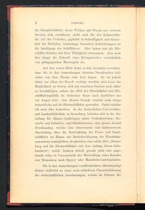 Auf den ersten Blick kann es den Anschein erwecken,dass die in den Anmerkungen citierten Drucksachen teil-weise von dem Thema sehr fern liegen. Es ist jedochdabei vor allem der Zweck verfolgt worden, dem Leser dieMöglichkeit zu bieten, sich mit einzelnen Partien noch näherzu beschäftigen, sodass das Bild der Elbschiffahrt und Elb-schiffahrtspolitik im weitesten Sinne noch deutlicher unsvor Augen tritt. Aus diesem Grunde wurden auch einigeSeitenblicke auf die Bheinschiffahrt geworfen. Dabei möchteich noch dies bemerken. In der Kaiserlichen Universitäts-und Landesbibliothek in Strassburg befinden sich in der Ab-teilung für Eisass-Lothringen unter Verkehrswesen, Ge-werbe und Industrie, und Handelswesen, eine grosse AnzahlDrucksachen, welche eine interessante und dankenswerteDarstellung über die Entwicklung der Fluss- und Canal-schiffahrt im Eisass mit Berücksichtigung der Eisenbahn-concurrenz ermöglichen; desgleichen eine solche über „Strass-burg und die Bheinschiffahrt seit dem Anfang dieses Jahr-hunderts“, welch 1 letztere Arbeit gerade jetzt sehr ange-bracht wäre in Vorraussicht der Herstellung eines Kanalesvon Strassburg nach Speyer oder Mannheim-Ludwigshafen.