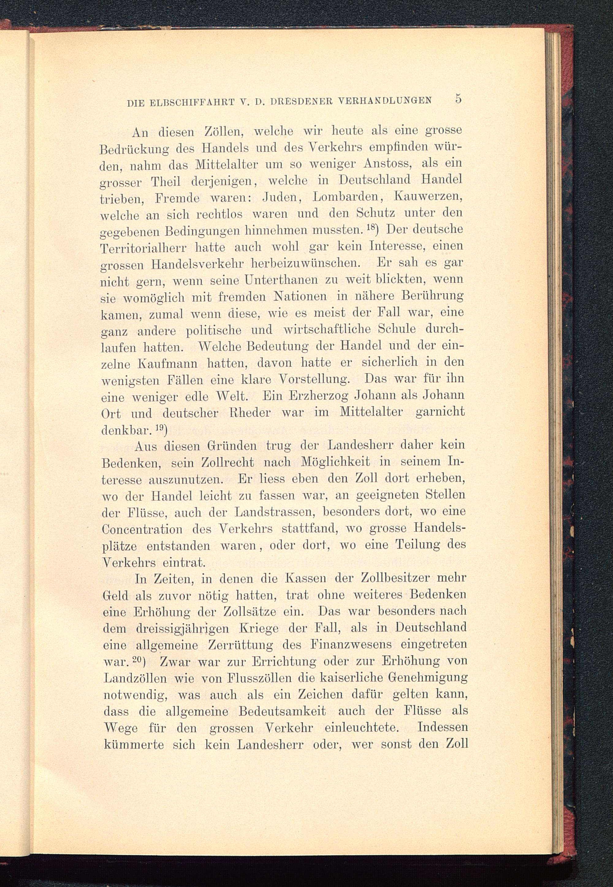 An diesen Zöllen, welche wir heute als eine grosseBedrückung des Handels und des Verkehrs empfinden wür-den, nahm das Mittelalter um so weniger Anstoss, als eingrosser Theil derjenigen, welche in Deutschland Handeltrieben, Fremde waren: Juden, Lombarden, Ivauwerzen,welche an sich rechtlos waren und den Schutz unter dengegebenen Bedingungen hinnehmen mussten. 18 ) Der deutscheTerritorialherr hatte auch wohl gar kein Interesse, einengrossen Handelsverkehr herbeizuwünschen. Er sah es garnicht gern, wenn seine Unterthanen zu weit blickten, wennsie womöglich mit fremden Nationen in nähere Berührungkamen, zumal ivenn diese, wie es meist der Fall war, eineganz andere politische und wirtschaftliche Schule durch-laufen hatten. Welche Bedeutung der Handel und der ein-zelne Kaufmann hatten, davon hatte er sicherlich in denwenigsten Fällen eine klare Vorstellung. Das war für ihneine weniger edle Welt. Ein Erzherzog Johann als JohannOrt und deutscher Rheder war im Mittelalter garnichtdenkbar. 19 )
