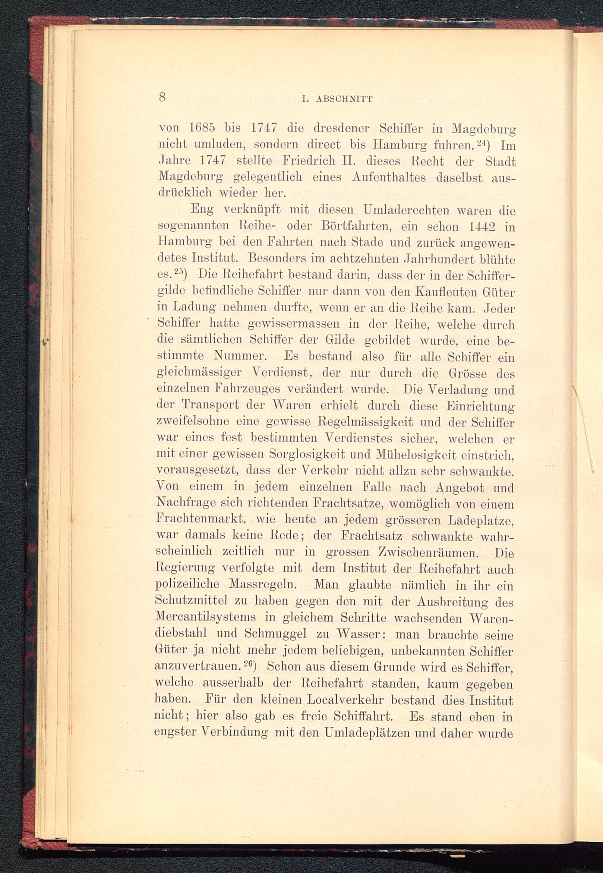 Eng verknüpft mit diesen Umladerechten waren diesogenannten Reihe- oder Börtfalnten, ein schon 1442 inHamburg bei den Fahrten nach Stade und zurück angewen-detes Institut. Besonders im achtzehnten Jahrhundert blühtees. 25 ) Die Reihefahrt bestand darin, dass der in der Schifter-gilde befindliche Schiffer nur dann von den Kaufleuten Güterin Ladung nehmen durfte, wenn er an die Reihe kam. JederSchiffer hatte gewissermassen in der Reihe, welche durchdie sämtlichen Schiffer der Gilde gebildet wurde, eine be-stimmte Nummer. Es bestand also für alle Schifter eingleichmässiger Verdienst, der nur durch die Grösse deseinzelnen Fahrzeuges verändert wurde. Die Verladung undder Transport der Waren erhielt durch diese Einrichtungzweifelsohne eine gewisse Regelmässigkeit und der Schifferwar eines fest bestimmten Verdienstes sicher, welchen ermit einer gewissen Sorglosigkeit und Mühelosigkeit einstrich,vorausgesetzt, dass der Verkehr nicht allzu sehr schwankte.Von einem in jedem einzelnen Falle nach Angebot undNachfrage sich richtenden Frachtsätze, womöglich von einemFrachtenmarkt, wie heute an jedem grösseren Ladeplatze,war damals keine Rede; der Frachtsatz schwankte wahr-scheinlich zeitlich nur in grossen Zwischenräumen. DieRegierung verfolgte mit dem Institut der Reihefahrt auchpolizeiliche Massregeln. Man glaubte nämlich in ihr einSchutzmittel zu haben gegen den mit der Ausbreitung desMercantilsystems in gleichem Schritte wachsenden Waren-diebstahl und Schmuggel zu Wasser: man brauchte seineGüter ja nicht mehr jedem beliebigen, unbekannten Schifferanzuvertrauen. 26 ) Schon aus diesem Grunde wird es Schiffer,welche ausserhalb der Reihefahrt standen, kaum gegebenhaben. Für den kleinen Localverkehr bestand dies Institutnicht; hier also gab es freie Schiffahrt. Es stand eben inengster Verbindung mit den Umladeplätzen und daher wurde