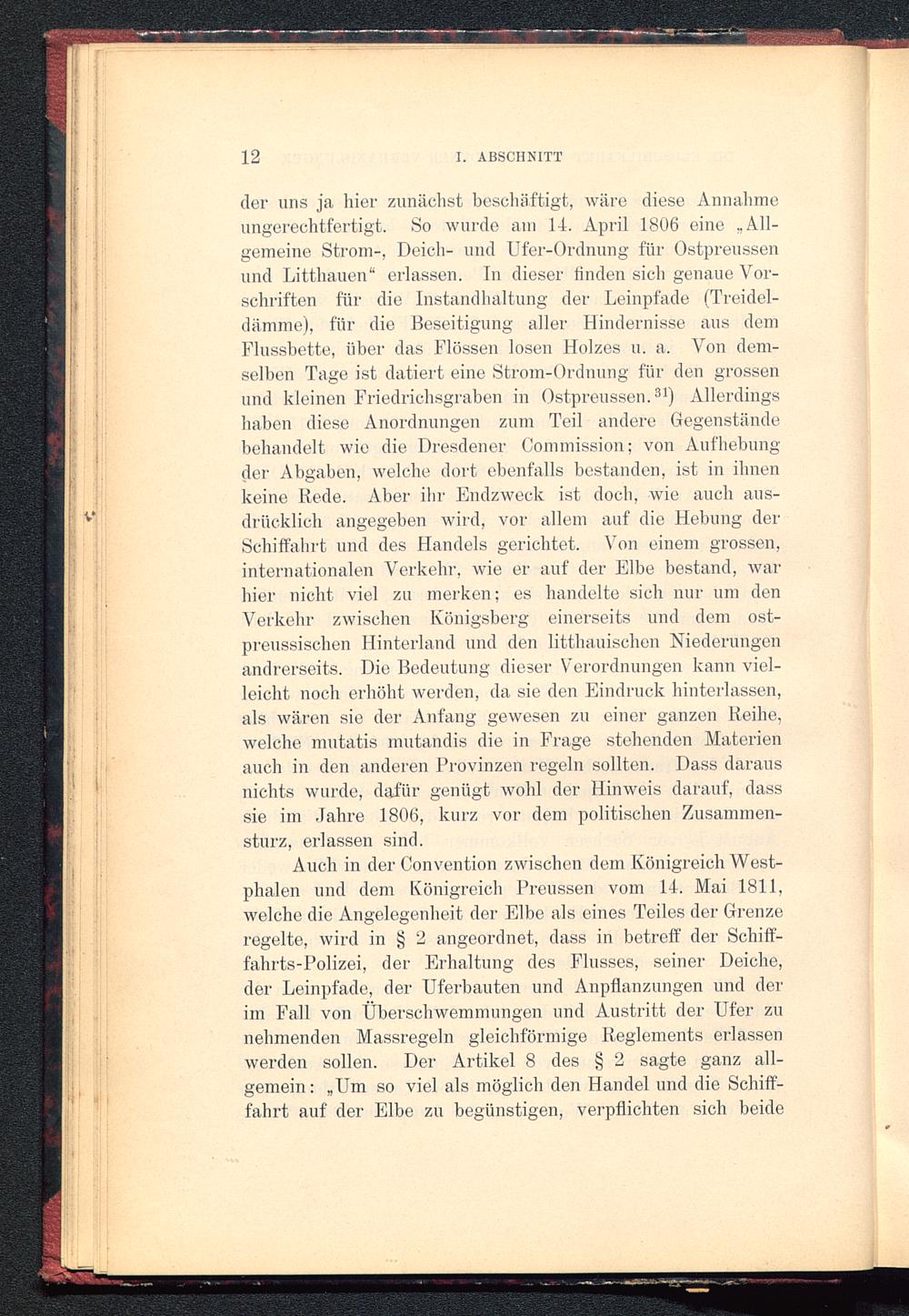 der uns ja hier zunächst beschäftigt, wäre diese Annahmeungerechtfertigt. So wurde am 14. April 1806 eine „All-gemeine Strom-, Deich- und Ufer-Ordnung für Ostpreussen und Litthauen“ erlassen. In dieser linden sich genaue Vor-schriften für die Instandhaltung der Leinpfade (Treidel-dämme), für die Beseitigung aller Hindernisse aus demFlussbette, über das Flössen losen Holzes u. a. Von dem-selben Tage ist datiert eine Strom-Ordnung für den grossenund kleinen Friedrichsgraben in Ostpreussen . 31 ) Allerdingshaben diese Anordnungen zum Teil andere Gegenständebehandelt wie die Dresdener Commission; von Aufhebungder Abgaben, welche dort ebenfalls bestanden, ist in ihnenkeine Rede. Aber ihr Endzweck ist doch, wie auch aus-drücklich angegeben wird, vor allem auf die Hebung derSchiffahrt und des Handels gerichtet. Von einem grossen,internationalen Verkehr, wie er auf der Elbe bestand, warhier nicht viel zu merken; es handelte sich nur um denVerkehr zwischen Königsberg einerseits und dem ost-preussischen Hinterland und den litthauischen Niederungenandrerseits. Die Bedeutung dieser Verordnungen kann viel-leicht noch erhöht werden, da sie den Eindruck hinterlassen,als wären sie der Anfang gewesen zu einer ganzen Reihe,welche mutatis inutandis die in Frage stehenden Materienauch in den anderen Provinzen regeln sollten. Dass darausnichts wurde, dafür genügt wohl der Hinweis darauf, dasssie im Jahre 1806, kurz vor dem politischen Zusammen-sturz, erlassen sind.