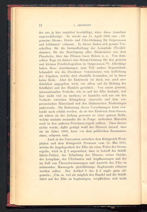 Auch in der Convention zwischen dem Königreich West-phalen und dem Königreich Preussen vom 14. Mai 1811,welche die Angelegenheit der Elbe als eines Teiles der Grenzeregelte, wird in § 2 angeordnet, dass in betreff der Schiff-fahrts-Polizei, der Erhaltung des Flusses, seiner Deiche,der Leinpfade, der Uferhauten und Anpflanzungen und derim Fall von Überschwemmungen und Austritt der Ufer zunehmenden Massregeln gleichförmige Reglements erlassenwerden sollen. Der Artikel 8 des § 2 sagte ganz all-gemein: „Um so viel als möglich den Handel und die Schiff-fahrt auf der Elbe zu begünstigen, verpflichten sich beide