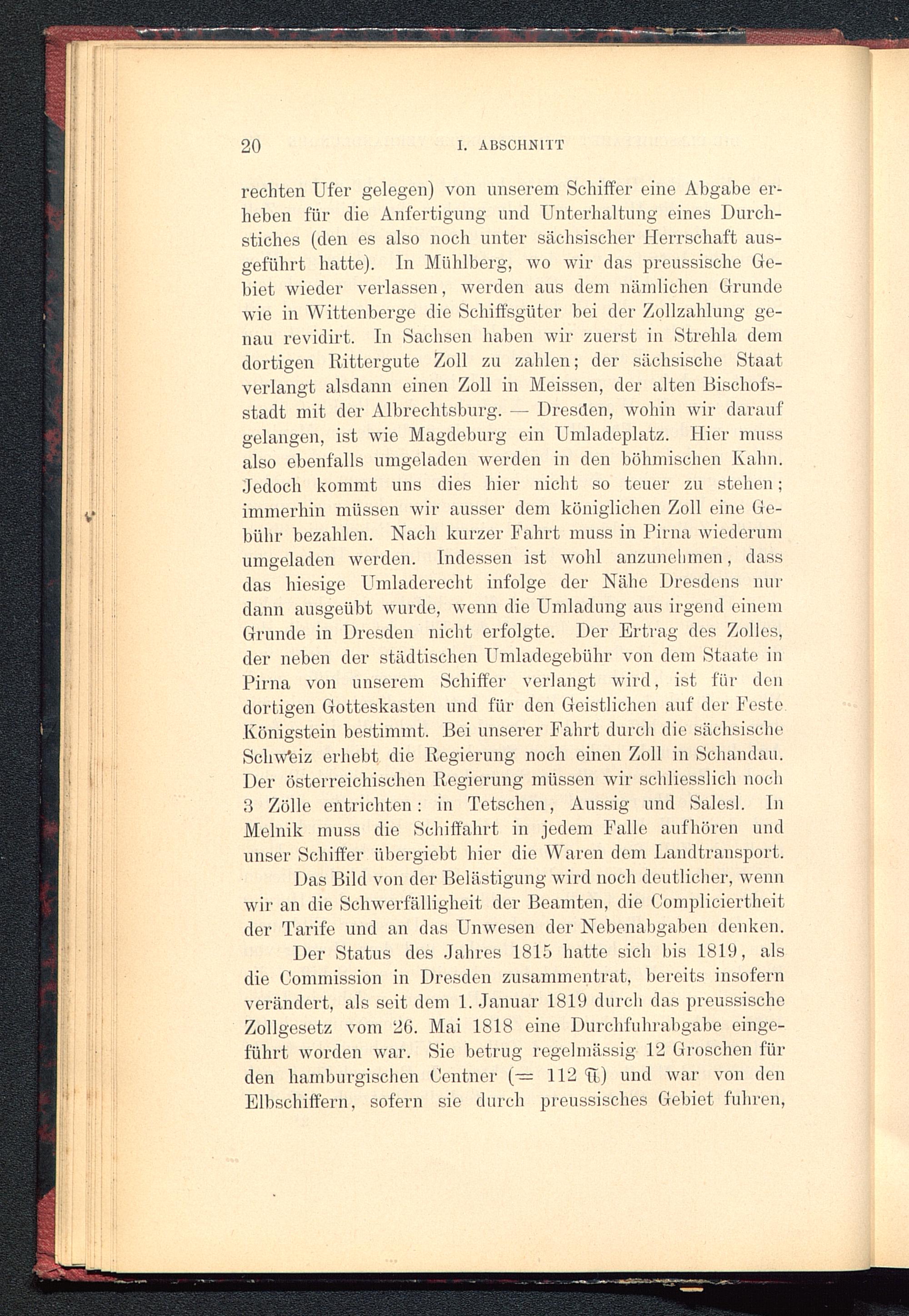 rechten Ufer gelegen) von unserem Schiffer eine Abgabe er-heben für die Anfertigung und Unterhaltung eines Durch-stiches (den es also noch unter sächsischer Herrschaft aus-geführt hatte). In Mühlberg, wo wir das preussische Ge-biet wieder verlassen, werden aus dem nämlichen Grundewie in Wittenberge die Schiffsgüter hei der Zollzahlung ge-nau revidirt. In Sachsen haben wir zuerst in Strelda demdortigen Kittergute Zoll zu zahlen; der sächsische Staatverlangt alsdann einen Zoll in Meissen , der alten Bischofs-stadt mit der Albrechtsburg. — Dresden , wohin wir daraufgelangen, ist wie Magdeburg ein Umladeplatz. Hier mussalso ebenfalls umgeladen werden in den böhmischen Kahn.Jedoch kommt uns dies hier nicht so teuer zu stehen;immerhin müssen wir ausser dem königlichen Zoll eine Ge-bühr bezahlen. Nach kurzer Fahrt muss in Pirna wiederumumgeladen werden. Indessen ist wohl anzuneimien, dassdas hiesige Umladerecht infolge der Nähe Dresdens nurdann ausgeübt wurde, wenn die Umladung aus irgend einemGrunde in Dresden nicht erfolgte. Der Ertrag des Zolles,der neben der städtischen Umladegebühr von dem Staate inPirna von unserem Schiffer verlangt wird, ist für dendortigen Gotteskasten und für den Geistlichen auf der FesteKönigstein bestimmt. Bei unserer Fahrt durch die sächsischeSchweiz erhebt die Regierung noch einen Zoll in Schandau .Der österreichischen Regierung müssen wir schliesslich noch3 Zölle entrichten: in Tetschen, Aussig und Salesl. InMelnik muss die Schiffahrt in jedem Falle aufhören undunser Schiffer übergiebt hier die Waren dem Landtransport.