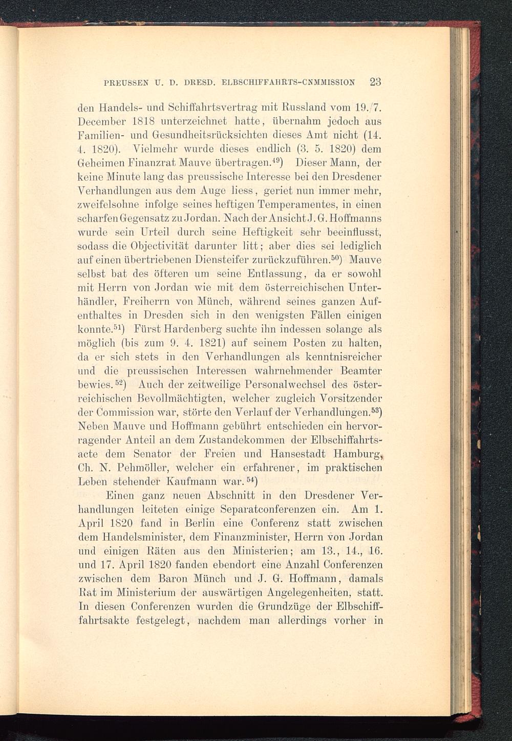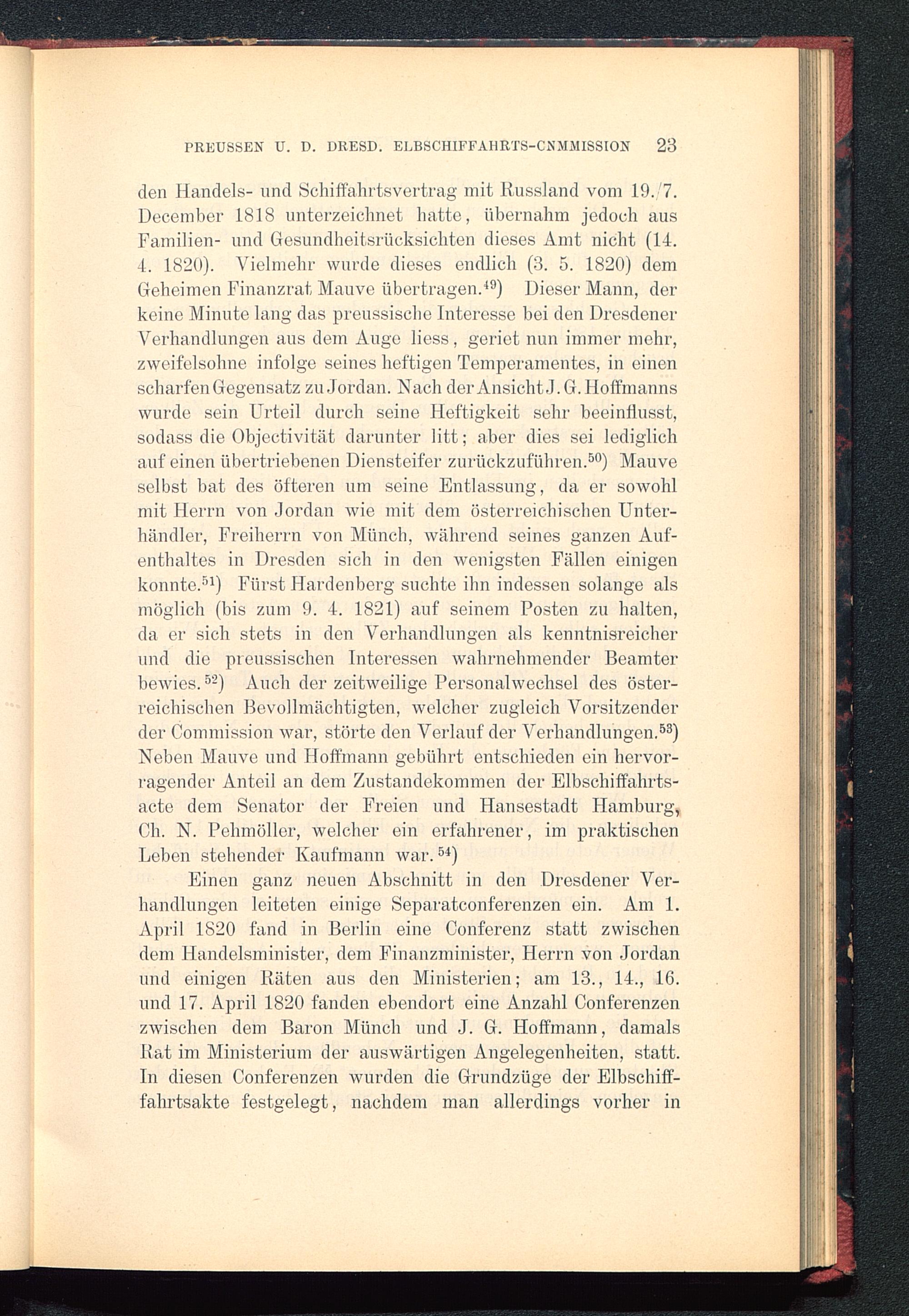 den Handels- und Schiffahrtsvertrag mit Russland vom 19. 7.December 1818 unterzeichnet hatte, übernahm jedoch ausFamilien- und Gesundheitsrücksichten dieses Amt nicht (14.4. 1820). Vielmehr wurde dieses endlich (3. 5. 1820) demGeheimen Finanzrat Mauve übertragen. 49 ) Dieser Mann, derkeine Minute lang das preussische Interesse bei den Dresdener Verhandlungen aus dem Auge liess, geriet nun immer mehr,zweifelsohne infolge seines heftigen Temperamentes, in einenscharfen Gegensatz zu Jordan. Nach derAnsichtJ.G.Hoffmannswurde sein Urteil durch seine Heftigkeit sehr beeinflusst,sodass die Objectivität darunter litt; aber dies sei lediglichauf einen übertriebenen Diensteifer zurückzuführen. 50 ) Mauveselbst bat des öfteren um seine Entlassung, da er sowohlmit Herrn von Jordan wie mit dem österreichischen Unter-händler, Freiherrn von Münch, während seines ganzen Auf-enthaltes in Dresden sich in den wenigsten Fällen einigenkonnte. 51 ) Fürst Hardenberg suchte ihn indessen solange alsmöglich (bis zum 9. 4. 1821) auf seinem Posten zu halten,da er sich stets in den Verhandlungen als kenntnisreicherund die preussischen Interessen wahrnehmender Beamterbewies. 5 ' 2 ) Auch der zeitweilige Personalwechsel des öster-reichischen Bevollmächtigten, welcher zugleich Vorsitzenderder Commission war, störte den Verlauf der Verhandlungen. 53 )Neben Mauve und Hoffmann gebührt entschieden ein hervor-ragender Anteil an dem Zustandekommen der Elbschiffahrts-acte dem Senator der Freien und Hansestadt Hamburg ,Ch. N. Pehmöller, welcher ein erfahrener, im praktischenLeben stehender Kaufmann war. 54 )