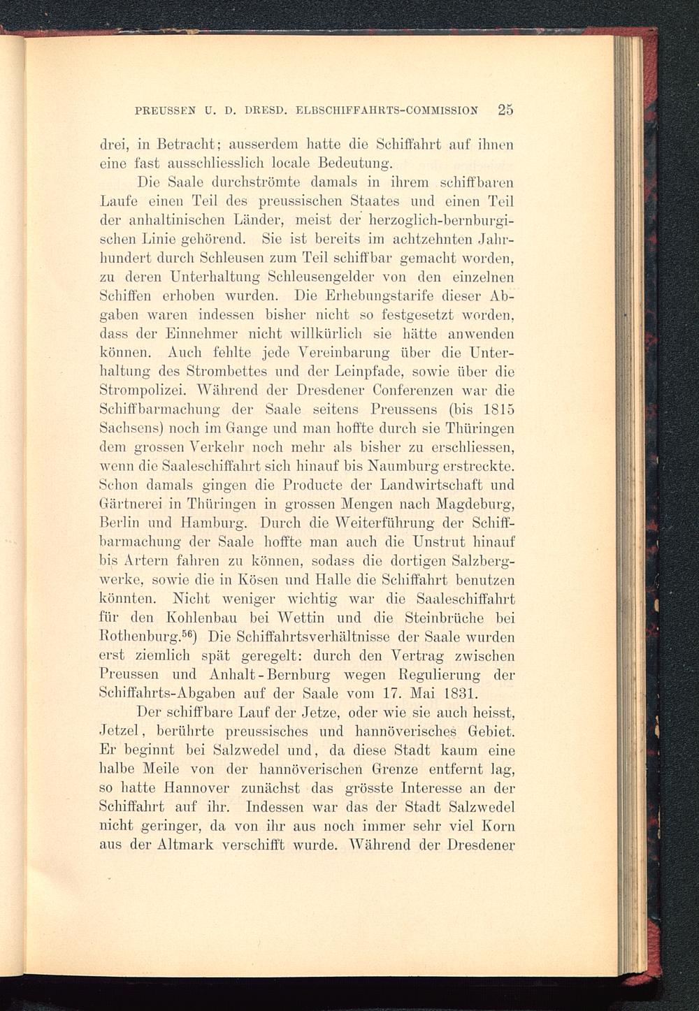 Die Saale durchströmte damals in ihrem schiffbarenLaufe einen Teil des preussischen Staates und einen Teilder anhaltinischen Länder, meist der herzoglich-bernburgi-schen Linie gehörend. Sie ist bereits im achtzehnten Jahr-hundert durch Schleusen zum Teil schiffbar gemacht worden,zu deren Unterhaltung Schleusengelder von den einzelnenSchiffen erhoben wurden. Die Erhebungstarife dieser Ab-gaben waren indessen bisher nicht so festgesetzt worden,dass der Einnehmer nicht willkürlich sie hätte anwendenkönnen. Auch fehlte jede Vereinbarung über die Unter-haltung des Strombettes und der Leinpfade, sowie über dieStrompolizei. Während der Dresdener Conferenzen war dieSchiffbarmachung der Saale seitens Preussens (bis 1815Sachsens) noch im Gange und man hoffte durch sie Thüringen dem grossen Verkehr noch mehr als bisher zu erschlossen,wenn die Saaleschiffahrt sich hinauf bis Naumburg erstreckte.Schon damals gingen die Producte der Landwirtschaft undGärtnerei in Thüringen in grossen Mengen nach Magdeburg ,Berlin und Hamburg . Durch die Weiterführung der Schiff-barmachung der Saale hoffte man auch die Unstrut hinaufbis Artern fahren zu können, sodass die dortigen Salzberg-werke, sowie die in Kosen und Halle die Schiffahrt benutzenkönnten. Nicht weniger wichtig war die Saaleschiffährtfür den Ivohlenbau bei Wettin und die Steinbrüche beiKothenburg. 56 ) Die Schiffahrtsverhältnisse der Saale wurdenerst ziemlich spät geregelt: durch den Vertrag zwischenPreussen und Anhalt-Bernburg wegen Regulierung derSchiffahrts-Abgaben auf der Saale vom 17. Mai 1881.