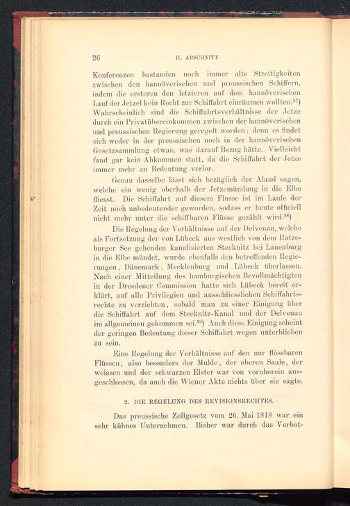Die Regelung der Verhältnisse auf der Delvenau, welcheals Fortsetzung der von Lübeck aus westlich von dem Ratze-burger See gehenden kanalisierten Stecknitz bei Lauenburg in die Elbe mündet, wurde ebenfalls den betreffenden Regie-rungen , Dänemark, Mecklenburg und Lübeck überlassen.Nach einer Mitteilung des hamburgischen Bevollmächtigtenin der Dresdener Commission hatte sich Lübeck bereit er-klärt, auf alle Privilegien und ausschliesslichen Schiffahrts-rechte zu verzichten, sobald man zu einer Einigung überdie Schiffahrt auf dem Stecknitz-Kanal und der Delvenauim allgemeinen gekommen sei. 5a ) Auch diese Einigung scheintder geringen Bedeutung dieser Schiffahrt wegen unterbliebenzu sein.