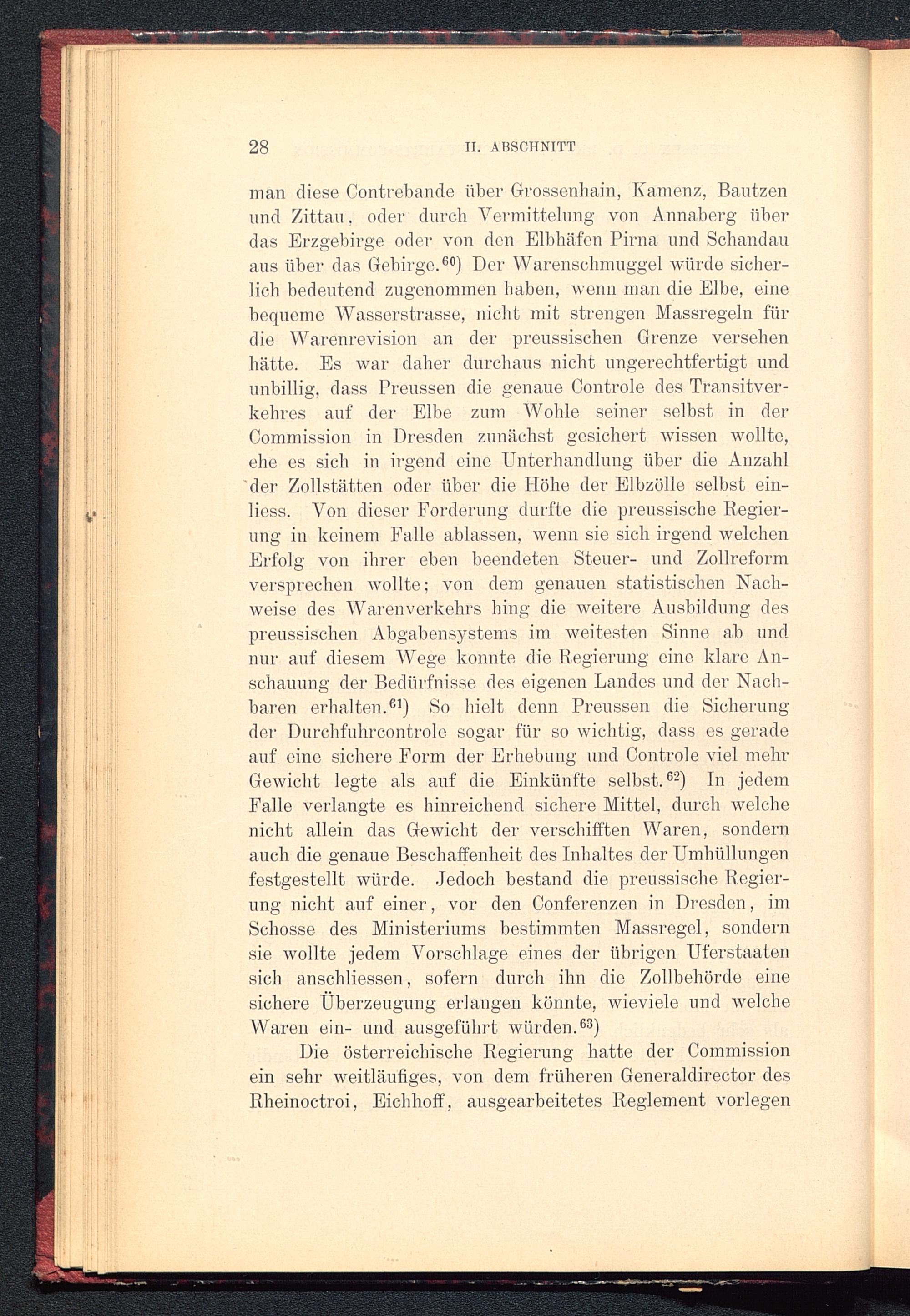 man diese Contrebande über Grossenbain, Kamenz, Bautzen und Zittau, oder durch Vermittelung von Annaberg überdas Erzgebirge oder von den Elbhäfen Pirna und Schandau aus über das Gebirge. 60 ) Der Warensclimuggel würde sicher-lich bedeutend zugenommen haben, wenn man die Elbe, einebequeme Wasserstrasse, nicht mit strengen Massregeln fürdie Warenrevision an der preussischen Grenze versehenhätte. Es war daher durchaus nicht ungerechtfertigt undunbillig, dass Preussen die genaue Controle des Transitver-kehres auf der Elbe zum Wolde seiner selbst in derCommission in Dresden zunächst gesichert wissen wollte,ehe es sich in irgend eine Unterhandlung über die Anzahlder Zollstätten oder über die Höhe der Elbzölle selbst ein-liess. Von dieser Forderung durfte die preussische Regier-ung in keinem Falle ablassen, wenn sie sich irgend welchenErfolg von ihrer eben beendeten Steuer- und Zollreformversprechen wollte; von dem genauen statistischen Nach-weise des Warenverkehrs hing die weitere Ausbildung despreussischen Abgabensystems im weitesten Sinne ab undnur auf diesem Wege konnte die Regierung eine klare An-schauung der Bedürfnisse des eigenen Landes und der Nach-baren erhalten. 61 ) So hielt denn Preussen die Sicherungder Durchfuhrcontrole sogar für so wichtig, dass es geradeauf eine sichere Form der Erhebung und Controle viel mehrGewicht legte als auf die Einkünfte selbst. 62 ) In jedemFalle verlangte es hinreichend sichere Mittel, durch welchenicht allein das Gewicht der verschifften Waren, sondernauch die genaue Beschaffenheit des Inhaltes der Umhüllungenfestgestellt würde. Jedoch bestand die preussische Regier-ung nicht auf einer, vor den Conferenzen in Dresden , imSchosse des Ministeriums bestimmten Massregel, sondernsie wollte jedem Vorschläge eines der übrigen Uferstaatensich anscldiessen, sofern durch ihn die Zollbehörde einesichere Überzeugung erlangen könnte, wieviele und welcheWaren ein- und ausgeführt würden. 63 )