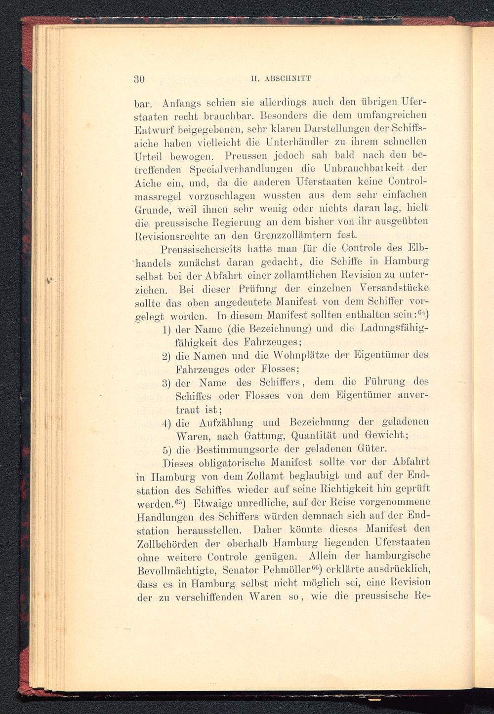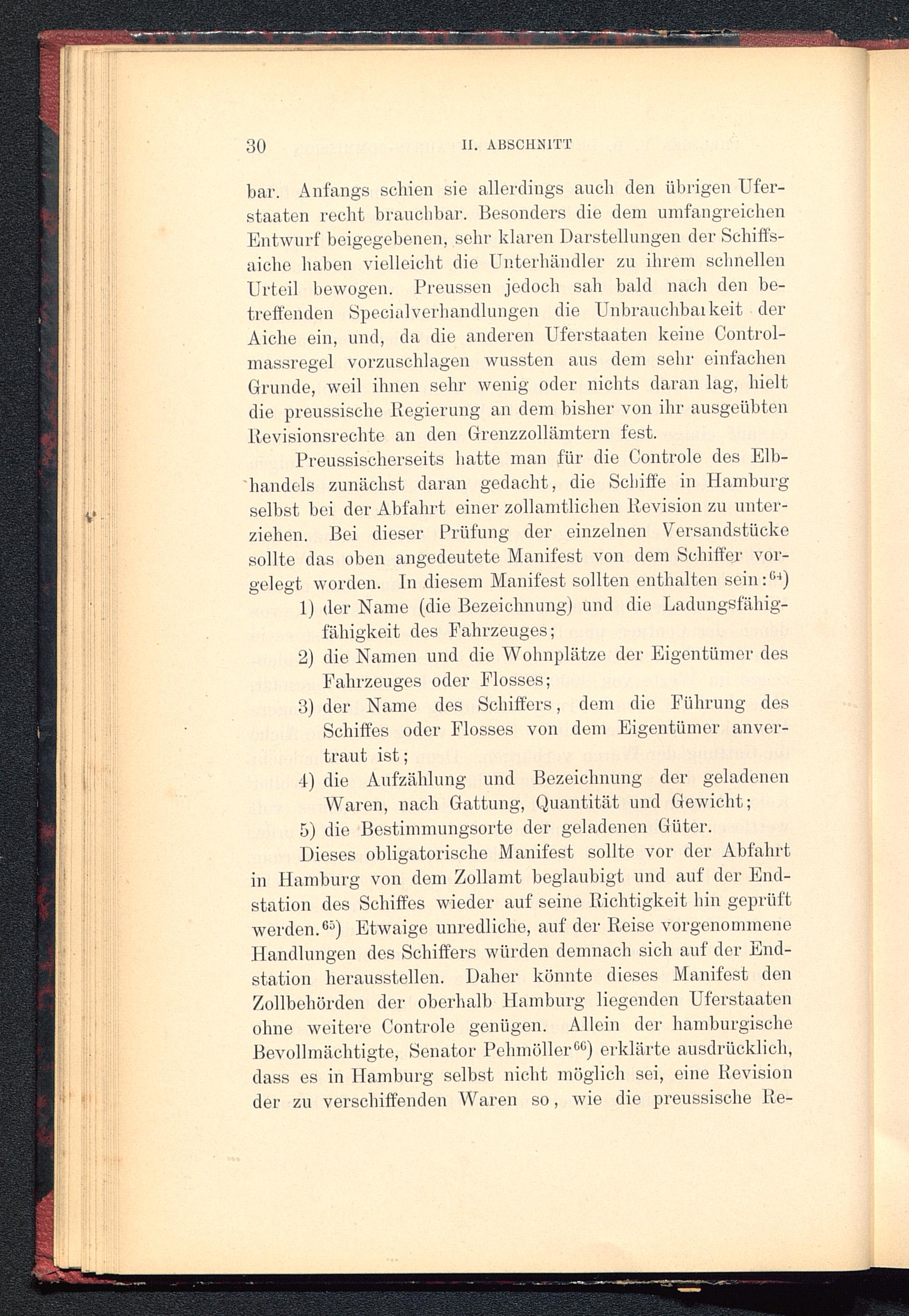Preussischerseits hatte man für die Controle des Elb-handels zunächst daran gedacht, die Schiffe in Hamburg selbst bei der Abfahrt einer zollamtlichen Revision zu unter-ziehen. Bei dieser Prüfung der einzelnen Versandstückesollte das oben angedeutete Manifest von dem Schiffer vor-gelegt worden. In diesem Manifest sollten enthalten sein: 64 )
