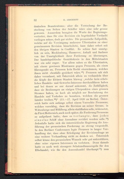 deutschen Beamtentums; aber die Versuchung der Be-stechung von Seiten der Schiffer wäre eine sehr grossegewesen. Ausserdem besagten die Worte der Regierungs-vertreter, dass für eine Revision ein begründeter Verdachtvorliegen müsse, doch gar nichts. Die preussische Zollpolitik,welche auf die Vereinigung mehrerer Uferstaaten zu einergemeinsamen Revision hinarbeitete, kam daher sofort mitden übrigen Staaten in Confiikt. Es schien fast unmög-lich zu sein, Mecklenburg, Hannover , Anhalt und Sachsenvon der Unmöglichheit ihrer Forderung zu überzeugen.Der handelspolitische Gesichtskreis in den Mittelstaatenwar ein sehr enger. Vor allem sahen es die Uferstaaten,mit einem gewissen Misstrauen gegen Preussen, als einenEhrenpunkt an, Preussen kein Recht einzuräumen, welchesihnen nicht ebenfalls gesichert wäre. 68 ) Preussen sah sichdaher veranlasst, mit Österreich allein zu verhandeln überdie Köpfe der kleinen Staaten hinweg „welche kein erheb-liches Handels- und Gewerbs-Interesse durchzuführen habenund bei denen es nur darauf ankommt, die Zufälligkeit,dass sie Besitzungen an einigen Uferpunkten eines grossenStromes haben, so hoch als möglich zur Beschatzung desHandels und Verkehrs zu benutzen, welchen die grossenLänder treiben. 69 )“ (13.—17. April 1820 zu Berlin). Öster-reich hatte sich anfangs selbst einem Vorrechte Preussens ,welches Vorschlag, dass die Revision an seiner Grenze, inWittenberge und Mühlberg, allein stattfinden solle, widersetzt,da Fürst Metternich, auch noch später, die Forderung Preussens so aufgefasst hatte, dass es verlangte, dass jedeseinzelne Schiff ohne Ausnahme revidirt werden solle. 70 )Jedenfalls hatte sich die österreichische Regierung die Aus-führung der preussischen Forderung zu streng vorgestellt.In den Berliner Conferenzeu legte Preussen in langer Ver-handlung dar, dass ohne Erledigung der Revisionsfrage aneine weitere Verhandlung nicht zu denken sei. Österreich selbst könne den preussischen Wunsch sehr gut unterstützen,ohne seine eigenen Interessen zu verletzen. Denn damalshatte es noch weit strengere Schutzzollmassregeln für denElbehandel, wie für den Aussenhandel überhaupt 71 ) zum
