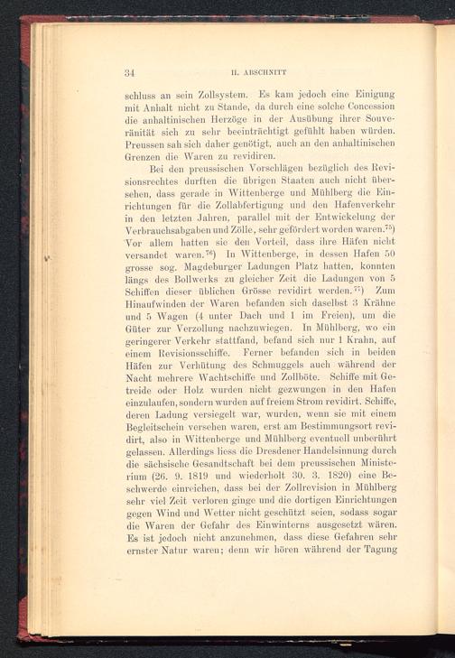 Bei den preussischen Vorschlägen bezüglich des Revi-sionsrechtes durften die übrigen Staaten auch nicht über-sehen, dass gerade in Wittenberge und Mühlberg die Ein-richtungen für die Zollabfertigung und den Hafenverkehrin den letzten Jahren, parallel mit der Entwickelung derVerbrauchsabgaben und Zölle, sehr gefördert worden waren. 75 )'Vor allem hatten sie den Vorteil, dass ihre Häfen nichtversandet waren. 76 ) In Wittenberge , in dessen Hafen 50grosse sog. Magdeburger Ladungen Platz hatten, konntenlängs des Bollwerks zu gleicher Zeit die Ladungen von 5Schiffen dieser üblichen Grösse revidirt werden. 77 ) ZumHinaufwinden der Waren befanden sich daselbst 3 Krähneund 5 Wagen (4 unter Dach und 1 im Freien), um dieGüter zur Verzollung nachzuwiegen. In Mühlberg, wo eingeringerer Verkehr stattfand, befand sich nur 1 Erahn, aufeinem Revisionsschiffe. Ferner befanden sich in beidenHäfen zur Verhütung dos Schmuggels auch während derNacht mehrere Wachtschiffe und Zollböte. Schiffe mit Ge-treide oder Holz wurden nicht gezwungen in den Hafeneinzulaufen, sondern wurden auf freiem Strom revidirt. Schiffe,deren Ladung versiegelt war, wurden, wenn sie mit einemBegleitschein versehen waren, erst am Bestimmungsort revi-dirt, also in Wittenberge und Mühlberg eventuell unberührtgelassen. Allerdings liess die Dresdener Handelsinnung durchdie sächsische Gesandtschaft bei dem preussischen Ministe-rium (26. 9. 1819 und wiederholt 30. 3. 1820) eine Be-schwerde einreichen, dass bei der Zollrevision in Mühlbergsehr viel Zeit verloren ginge und die dortigen Einrichtungengegen Wind und Wetter nicht geschützt seien, sodass sogardie Waren der Gefahr des Eimvinterns ausgesetzt wären.Es ist jedoch nicht anzunehmen, dass diese Gefahren sehrernster Natur waren; denn wir hören während der Tagung