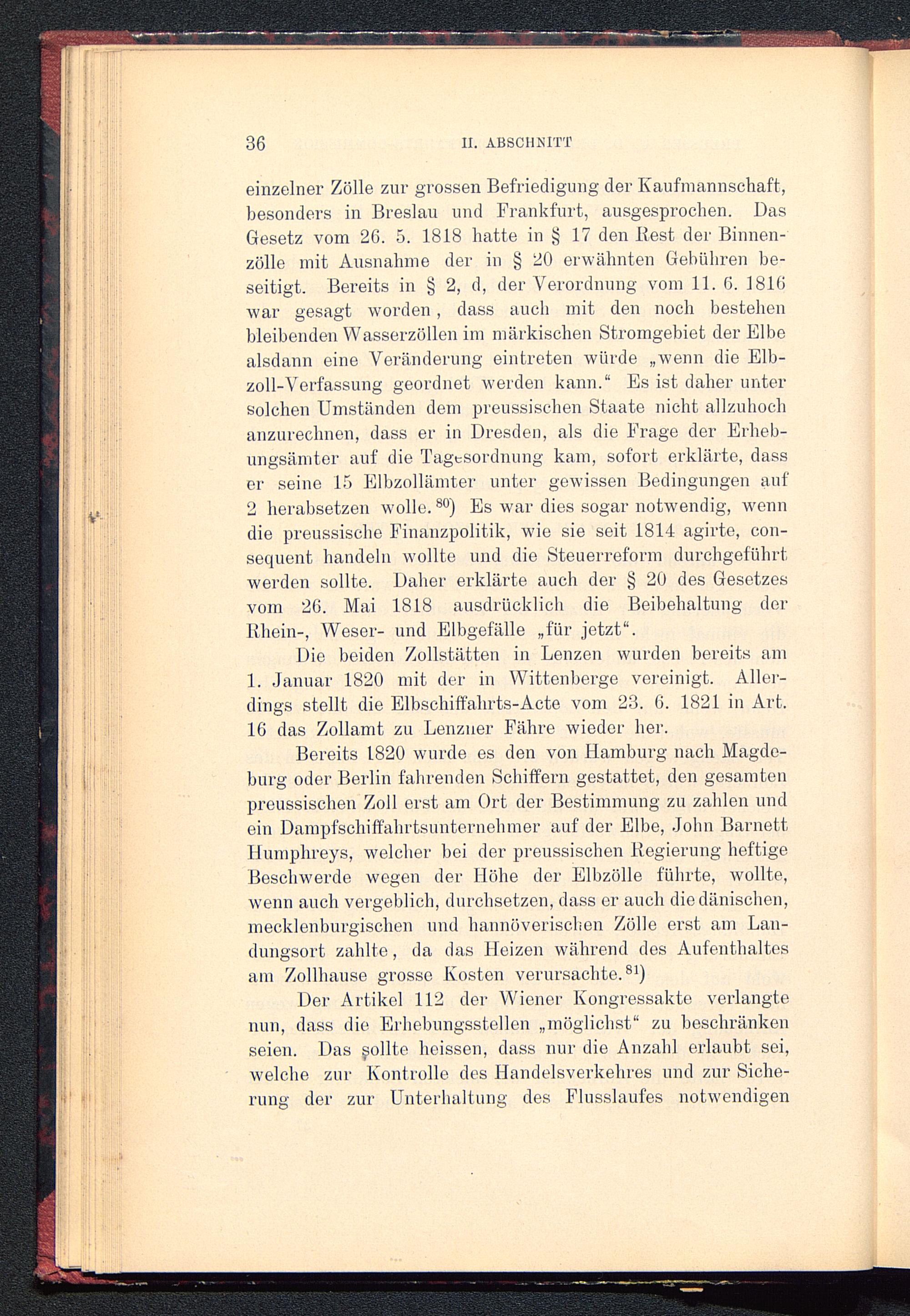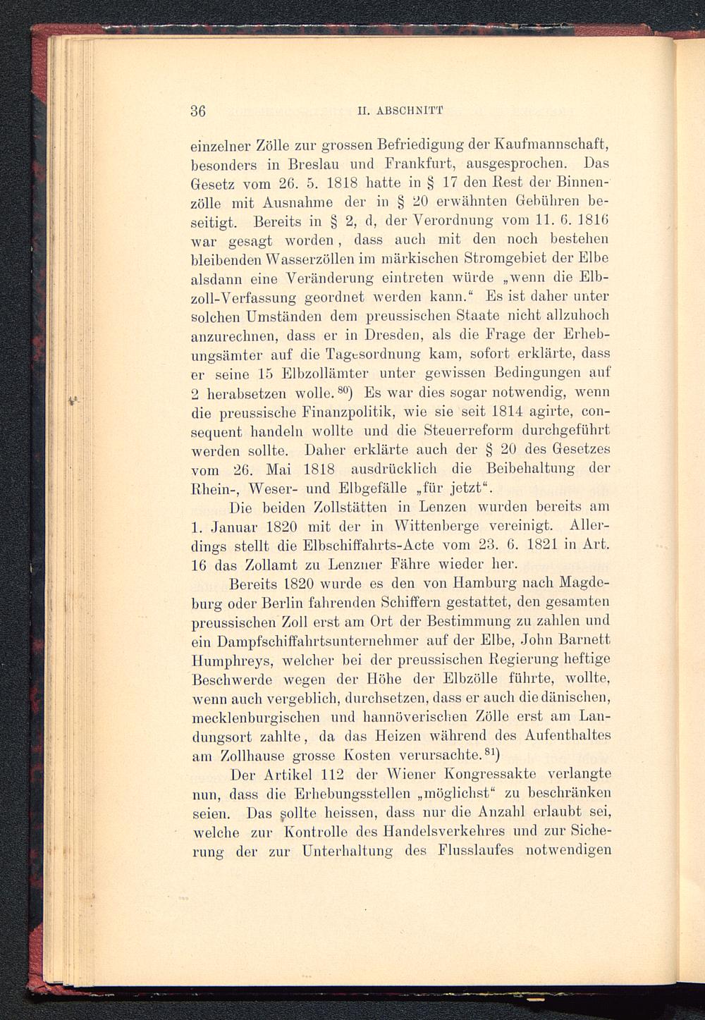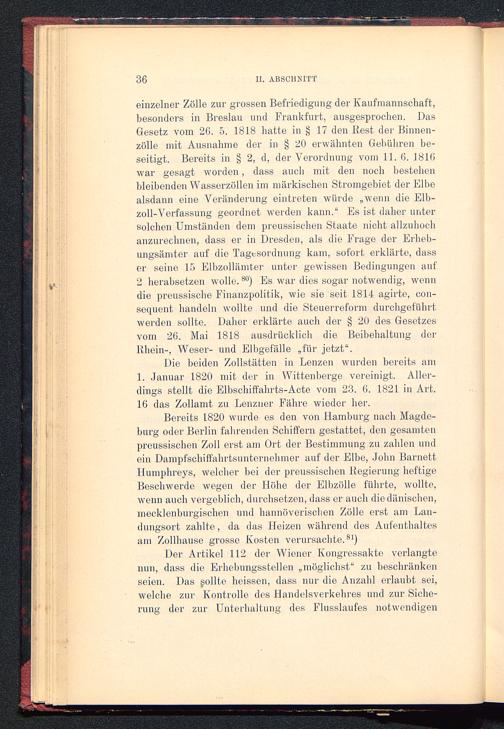 einzelner Zölle zur grossen Befriedigung der Kaufmannschaft,besonders in Breslau und Frankfurt , ausgesprochen. DasGesetz vom 26. 5. 1818 hatte in § 17 den Best der Binnen-zölle mit Ausnahme der in § 20 erwähnten Gebühren be-seitigt. Bereits in § 2, d, der Verordnung vom 11. 6. 1816war gesagt worden, dass auch mit den noch bestehenbleibenden Wasserzöllen im märkischen Stromgebiet der Elbealsdann eine Veränderung eintreten würde „wenn die Elb-zoll-Verfassung geordnet werden kann.“ Es ist daher untersolchen Umständen dem preussischen Staate nicht allzuhochanzurechnen, dass er in Dresden , als die Frage der Erheb-ungsämter auf die Tagesordnung kam, sofort erklärte, dasser seine 15 Elbzollämter unter gewissen Bedingungen auf2 herabsetzen wolle. 80 ) Es war dies sogar notwendig, wenndie preussische Finanzpolitik, wie sie seit 1814 agirte, con-seciuent handeln wollte und die Steuerreform durchgeführtwerden sollte. Daher erklärte auch der § 20 des Gesetzesvom 26. Mai 1818 ausdrücklich die Beibehaltung derlthein-, Weser - und Elbgefälle „für jetzt“.