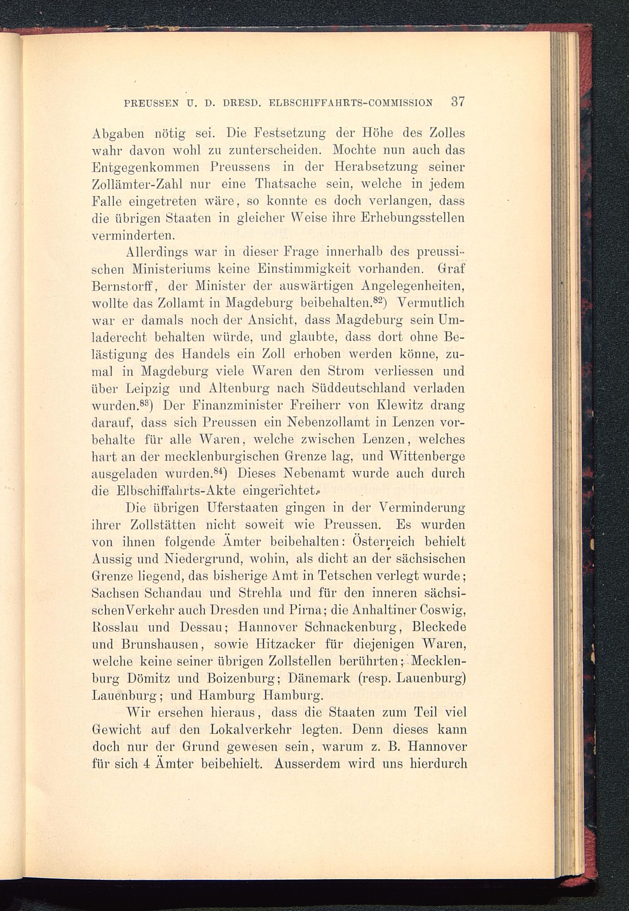 Allerdings war in dieser Frage innerhalb des preussi-schen Ministeriums keine Einstimmigkeit vorhanden. GrafBernstorff, der Minister der auswärtigen Angelegenheiten,wollte das Zollamt in Magdeburg beibehalten. 82 ) Vermutlichwar er damals noch der Ansicht, dass Magdeburg sein Um-laderecht behalten würde, und glaubte, dass dort ohne Be-lästigung des Handels ein Zoll erhoben werden könne, zu-mal in Magdeburg viele Waren den Strom verliessen undüber Leipzig und Altenburg nach Süddeutschland verladenwurden. 88 ) Der Finanzminister Freiherr von Klewitz drangdarauf, dass sich Preussen ein Nebenzollamt in Lenzen Vor-behalte für alle Waren, welche zwischen Lenzen, welcheshart an der mecklenburgischen Grenze lag, und Wittenberge ausgeladen wurden. 84 ) Dieses Nebenamt wurde auch durchdie Elbschiffahrts-Akte eingerichtet.«