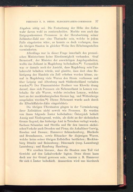 Die übrigen Uferstaaten gingen in der Verminderungihrer Zollstätten nicht soweit wie Preussen. Es wurdenvon ihnen folgende Ämter beibehalten: Österreich behieltAussig und Niedergrund, wohin, als dicht an der sächsischenGrenze liegend, das bisherige Amt in Tetschen verlegt wurde;Sachsen Schandau und Strehla und für den inneren sächsi-schenVerkehr auch Dresden und Pirna; die Anhaltiner Coswig ,Rosslau und Dessau; Hannover Schnackenburg, Bleckede und Brunshausen, sowie Hitzacker für diejenigen Waren,welche keine seiner übrigen Zollstellen berührten; Mecklen-burg Dömitz und Boizenburg; Dänemark (resp. Lauenburg )Lauenburg; und Hamburg Hamburg .