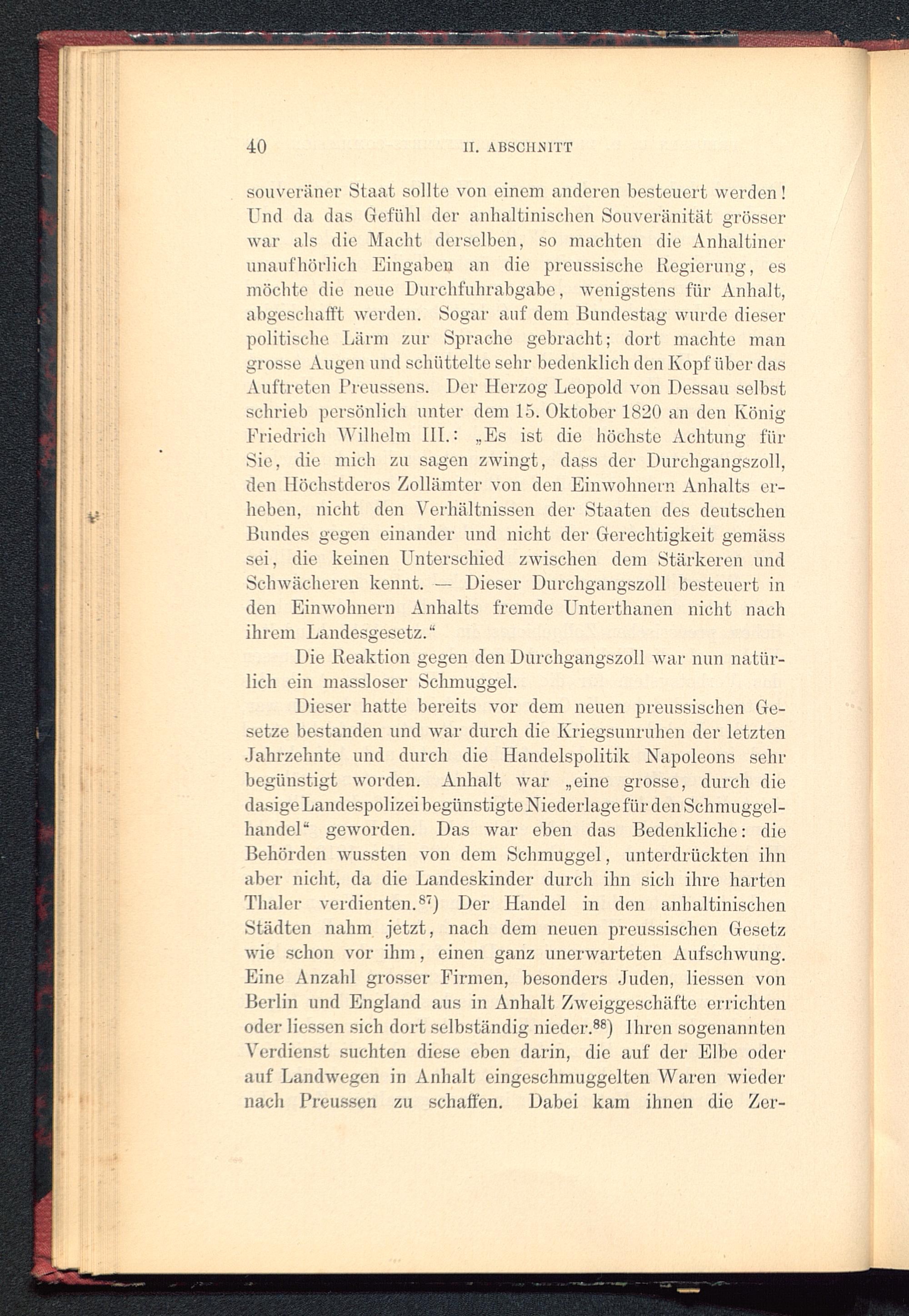 souveräner Staat sollte von einem anderen besteuert werden !Und da das Gefühl der anhaltinischen Souveränität grösserwar als die Macht derselben, so machten die Anhaltinerunaufhörlich Eingaben an die prcussische Regierung, esmöchte die neue Durchfuhrabgabe, wenigstens für Anhalt,abgeschafft werden. Sogar auf dem Bundestag wurde dieserpolitische Lärm zur Sprache gebracht; dort machte mangrosse Augen und schüttelte sehr bedenklich den Kopf über dasAuftreten Preussens . Der Herzog Leopold von Dessau selbstschrieb persönlich unter dem 15. Oktober 1820 an den KönigFriedrich Wilhelm 111.: „Es ist die höchste Achtung fürSie, die mich zu sagen zwingt, dass der Durchgangszoll,den Höehstderos Zollämter von den Einwohnern Anhalts er-heben, nicht den Verhältnissen der Staaten des deutschenBundes gegen einander und nicht der Gerechtigkeit gemässsei, die keinen Unterschied zwischen dem Stärkeren undSchwächeren kennt. - Dieser Durchgangszoll besteuert inden Einwohnern Anhalts fremde Unterthanen nicht nachihrem Landesgesetz.“