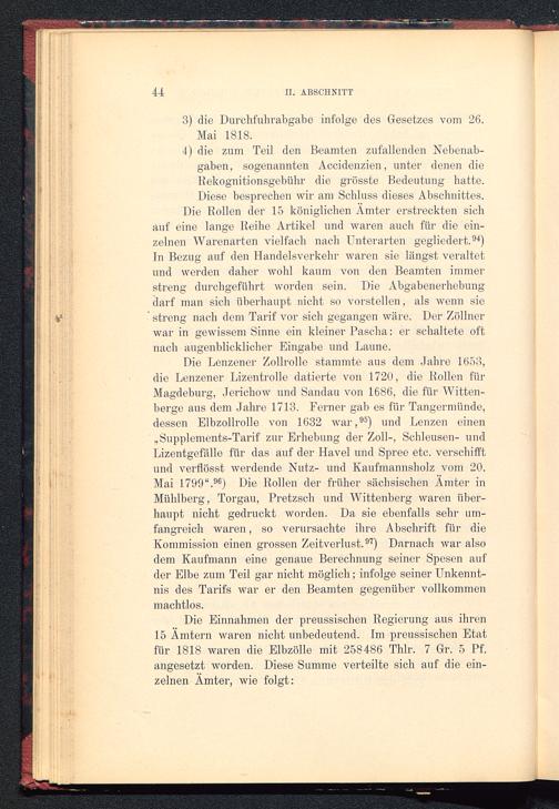 Die Lenzener Zollrolle stammte aus dem Jahre 1653,die Lenzener Lizentrolle datierte von 1720, die Rollen fürMagdeburg, Jeriehow und Sandau von 1686, die für Witten-berge aus dem Jahre 1713. Ferner gab es für Tangermünde ,dessen Elbzollrolle von 1632 war, 95 ) und Lenzen einen, Supplements-Tarif zur Erhebung der Zoll-, Schleusen- undLizentgefälle für das auf der Havel und Spree etc. verschifftund verflösst werdende Nutz- und Kaufmannsholz vom 20.Mai 1799“. 96 ) Die Rollen der früher sächsischen Ämter inMühlberg, Torgau, Pretzsch und Wittenberg waren über-haupt nicht gedruckt worden. Da sie ebenfalls sehr um-fangreich waren, so verursachte ihre Abschrift für dieKommission einen grossen Zeitverlust. 97 ) Darnach war alsodem Kaufmann eine genaue Berechnung seiner Spesen aufder Elbe zum Teil gar nicht möglich; infolge seiner Unkennt-nis des Tarifs war er den Beamten gegenüber vollkommenmachtlos.
