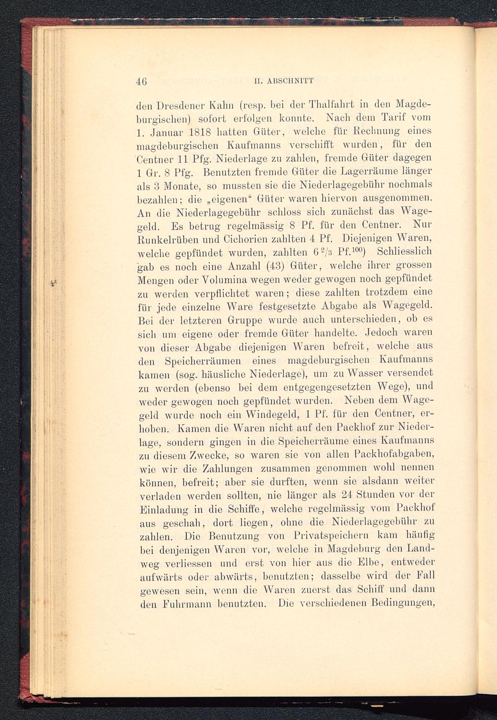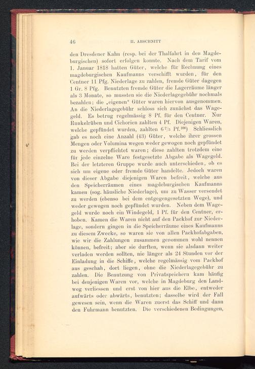 den Dresdener Kahn (resp. bei der Thal fahrt in den Magde-burgischen) sofort erfolgen konnte. Nach dem Tarif vom1. Januar 1818 hatten Güter, welche für Rechnung einesmagdeburgischen Kaufmanns verschifft wurden, für denCentner 11 Pfg. Niederlage zu zahlen, fremde Güter dagegen1 Gr. 8 Pfg. Benutzten fremde Güter die Lagerräume längerals 3 Monate, so mussten sie die Niederlagegebühr nochmalsbezahlen; die „eigenen“ Güter waren hiervon ausgenommen.An die Niederlagegebühr schloss sich zunächst das Wage-geld. Es betrug regelmässig 8 Pf. für den Centner. NurRunkelrüben und Cichorien zahlten 4 Pf. Diejenigen Waren,welche gepfändet wurden, zahlten 6 2 /a Pf. 100 ) Schliesslichgab es noch eine Anzahl (43) Güter, welche ihrer grossenMengen oder Volumina wegen weder gewogen noch gepfändetzu werden verpflichtet waren; diese zahlten trotzdem einefür jede einzelne Ware festgesetzte Abgabe als Wagegeld.Bei der letzteren Gruppe wurde auch unterschieden, ob essich um eigene oder fremde Güter handelte. Jedoch warenvon dieser Abgabe diejenigen Waren befreit, welche ausden Speicherräumen eines magdeburgischen Kaufmannskamen (sog. häusliche Niederlage), um zu Wasser versendetzu werden (ebenso bei dem entgegengesetzten Wege), undweder gewogen noch gepfündet wurden. Neben dem Wage-geld wurde noch ein Windegeld, 1 Pf. für den Centner, er-hoben. Kamen die Waren nicht auf den Packhof zur Nieder-lage, sondern gingen in die Speicherräume eines Kaufmannszu diesem Zwecke, so waren sie von allen Packhofabgaben,wie wir die Zahlungen zusammen genommen wohl nennenkönnen, befreit; aber sie durften, wenn sie alsdann weiterverladen werden sollten, nie länger als 24 Stunden vor derEinladung in die Schiffe, welche regelmässig vom Packhofaus geschah, dort liegen, ohne die Niederlagegebühr zuzahlen. Die Benutzung von Privatspeichern kam häufigbei denjenigen Waren vor, welche in Magdeburg den Land-weg verliessen und erst von hier aus die El he, entwederaufwärts oder abwärts, benutzten; dasselbe wird der Fallgewesen sein, wenn die Waren zuerst das Schiff und dannden Fuhrmann benutzten. Die verschiedenen Bedingungen,