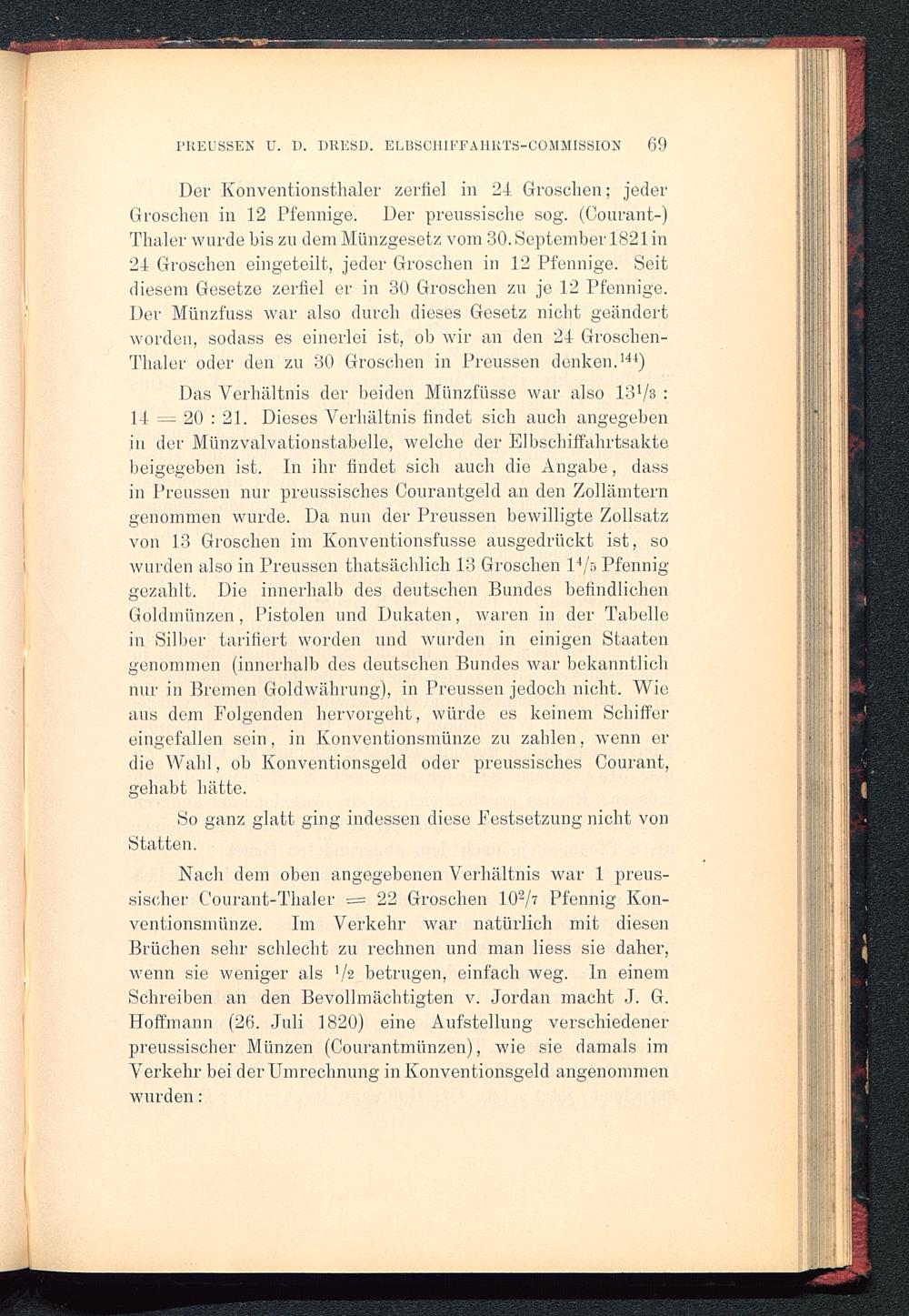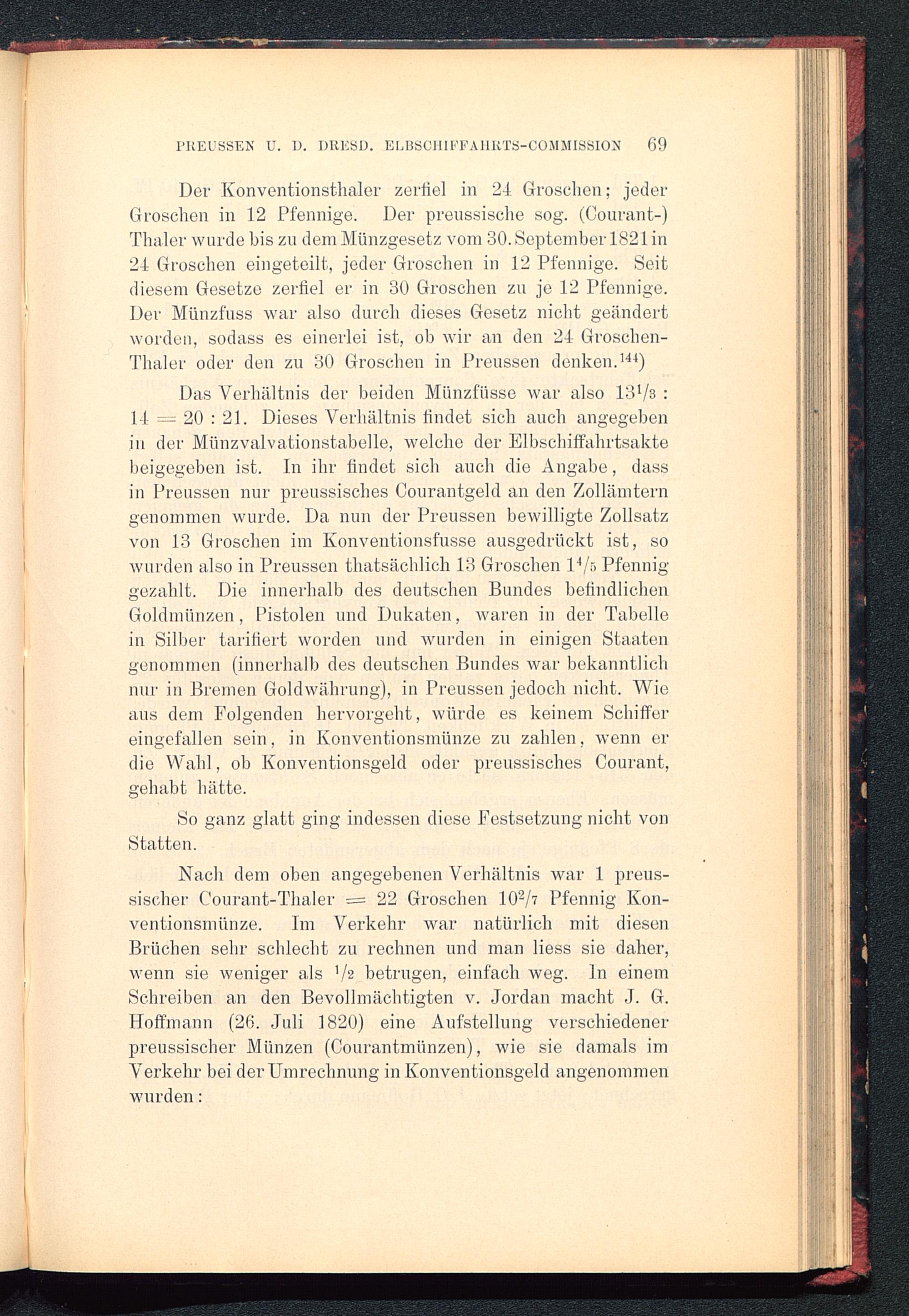 Der Konventionstlialer zerfiel in 24 Groschen; jederGroschen in 12 Pfennige. Der preussische sog. (Courant-)Thaler wurde bis zu dem Münzgesetz vom 30. September 1821 in24 Groschen eingeteilt, jeder Groschen in 12 Pfennige. Seitdiesem Gesetze zerfiel er in 30 Groschen zu je 12 Pfennige.Der Münzfuss war also durch dieses Gesetz nicht geändertworden, sodass es einerlei ist, ob wir an den 24 Groschen-Thaler oder den zu 30 Groschen in Preussen denken. 144 )