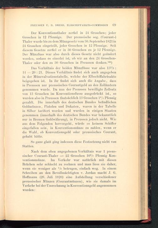 Das Verhältnis der beiden Münzlusse war also UP/s :14 = 20 : 21. Dieses Verhältnis findet sich auch angegebenin der Münzvalvationstabelle, welche der Elbschiffahrtsaktebeigegeben ist. In ihr findet sich auch die Angabe, dassin Preussen nur preussisches Courantgeld an den Zollämterngenommen wurde. Da nun der Preussen bewilligte Zollsatzvon 13 Groschen im Konventionsfusse ausgedrückt ist, sowurden also in Preussen thatsächlich 13 Groschen l 4 /s Pfenniggezahlt. Die innerhalb des deutschen Bundes befindlichenGoldmünzen, Pistolen und Dukaten, waren in der Tabellein Silber tarifiert worden und wurden in einigen Staatengenommen (innerhalb des deutschen Bundes war bekanntlichnur in Bremen Goldwährung), in Preussen jedoch nicht. Wieaus dem Folgenden hervorgeht, würde es keinem Schiffereingefallen sein, in Konventionsmünze zu zahlen, wenn erdie Wahl, ob Konventionsgeld oder preussisches Courant,gehabt hätte.