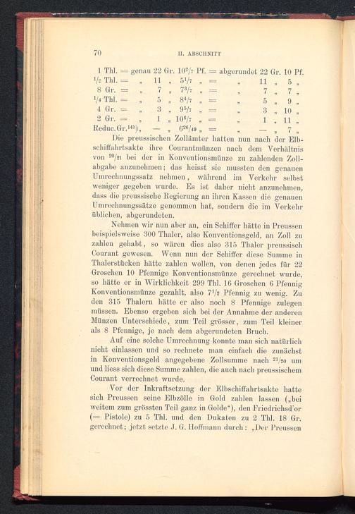 Nehmen wir nun aber an, ein Schiffer hätte in Preussen beispielsweise 300 Tlialer, also Konventionsgeld, an Zoll zuzahlen gehabt, so wären dies also 315 Tlialer preussischCourant gewesen. Wenn nun der Schiffer diese Summe inThalerstücken hätte zahlen wollen, von denen jedes für 22Groschen 10 Pfennige Konventionsmünze gerechnet wurde,so hätte er in Wirklichkeit 299 Thl. 16 Groschen 6 PfennigKonventionsmünze gezahlt, also 77'2 Pfennig zu wenig. Zuden 315 Thalern hätte er also noch 8 Pfennige zulegenmüssen. Ebenso ergeben sich bei der Annahme der anderenMünzen Unterschiede, zum Teil grösser, zum Teil kleinerals 8 Pfennige, je nach dem abgerundeten Bruch.